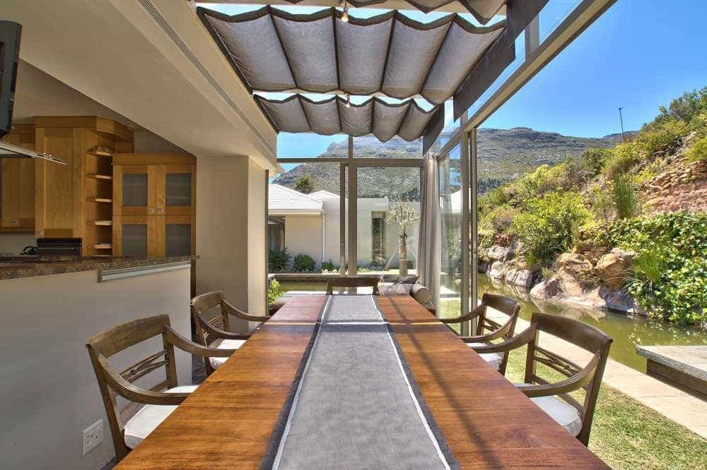 Lounge is spacious with TV and great views of the harbour and mountain, opens up to a beautiful undercover patio with upmarket outdoor furniture. Dining room seats 8 to 10 with magnificent uninterrupted views, as well as an outside, under cover dining area seating up to 14.