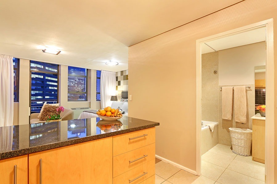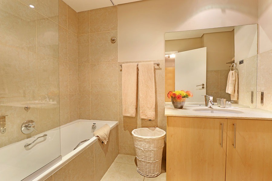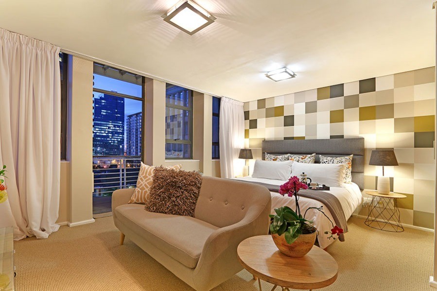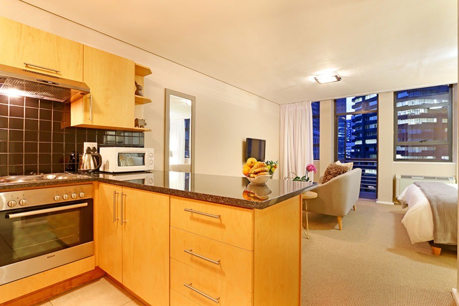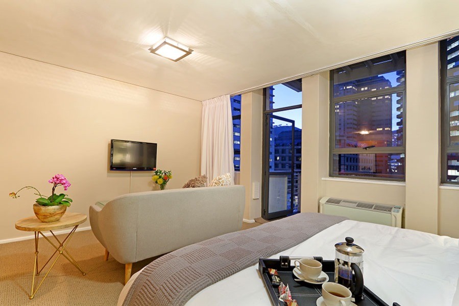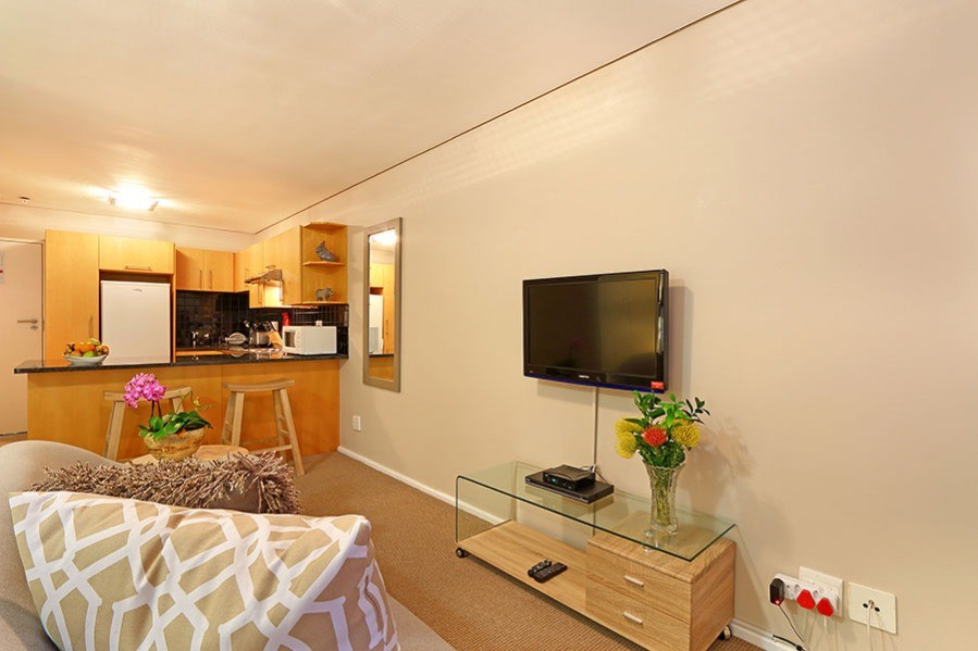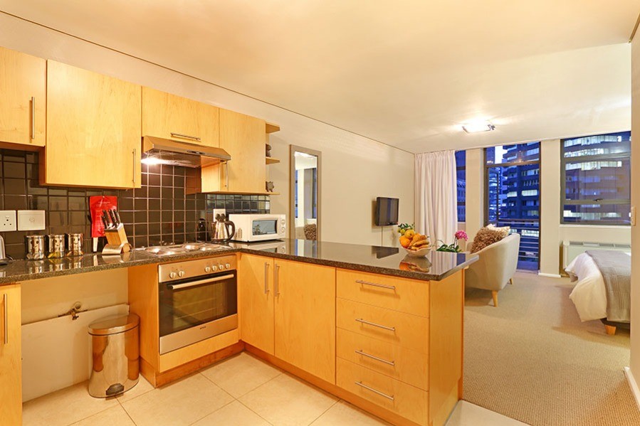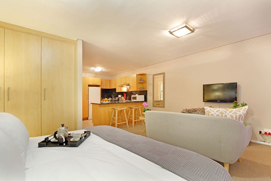 The spacious open-plan studio apartment has a great sense of style and a whole lot of good taste. The kitchen has all the necessities for self-catering and the bed area is distinguished from the lounge by a sofa facing a Flatscreen TV with cable channels. Balcony views across Cape Town’s city skyline can be seen from the lounge and bedroom.