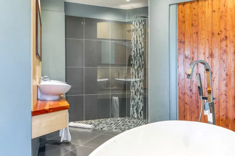 Room 1 – King bed (can be converted to twin) with a lounge area and sea views from the lounge area opening onto a balcony