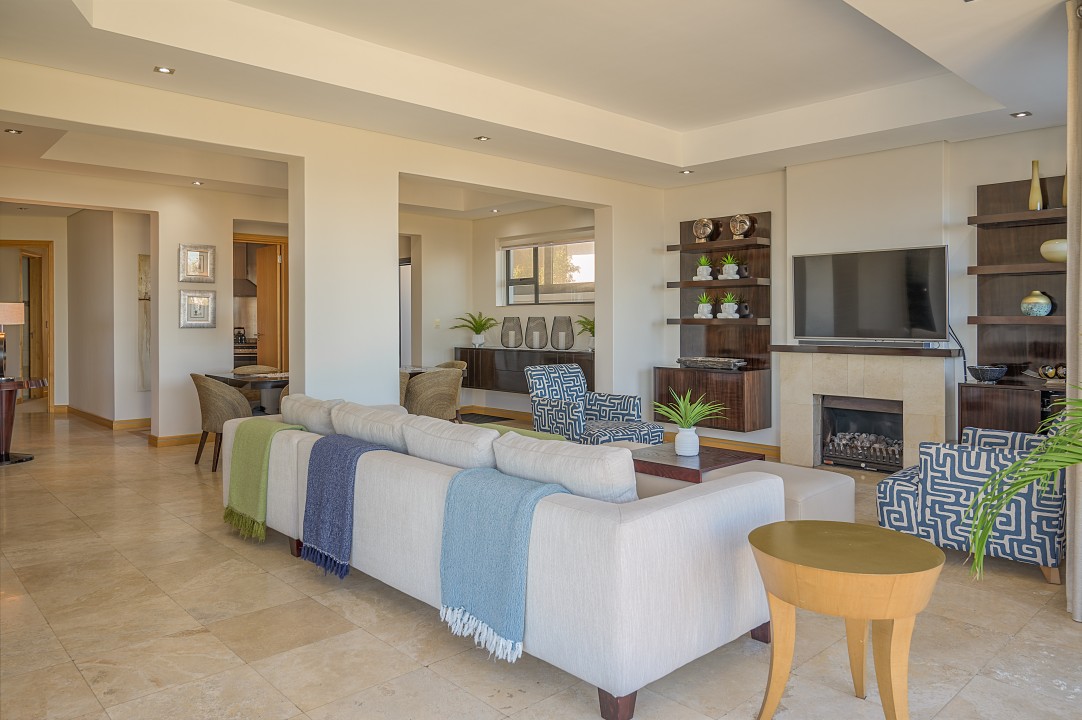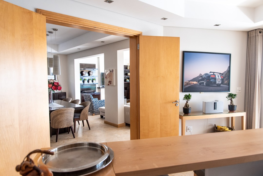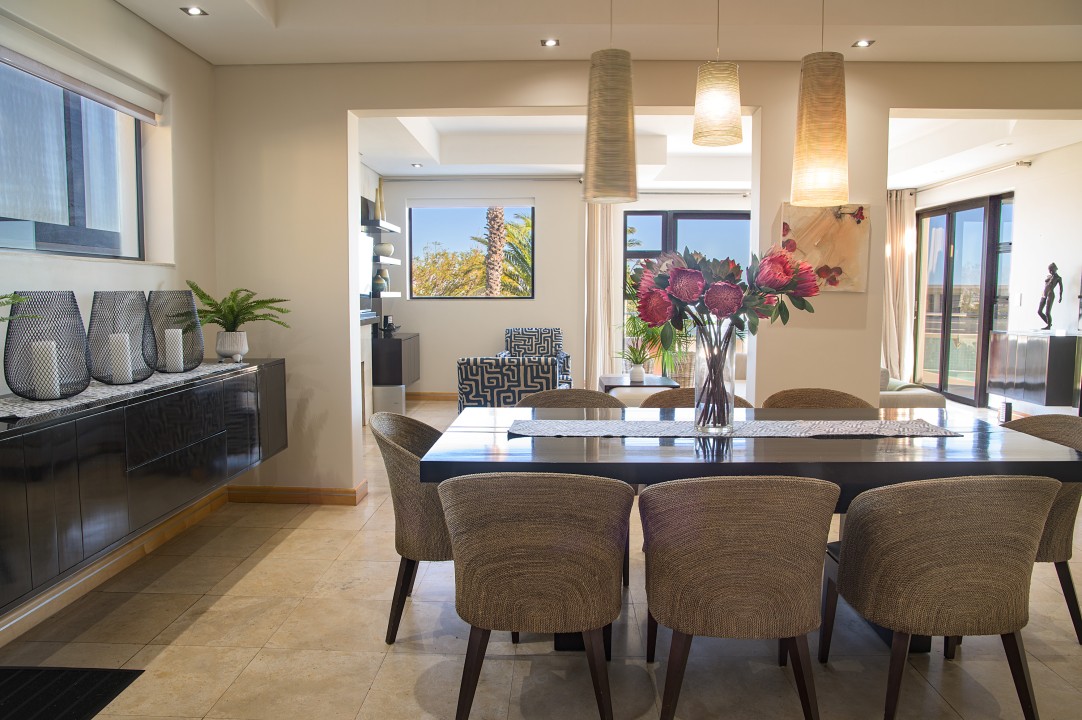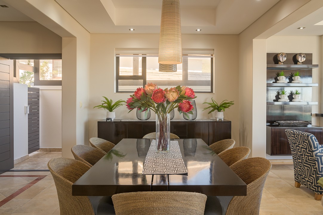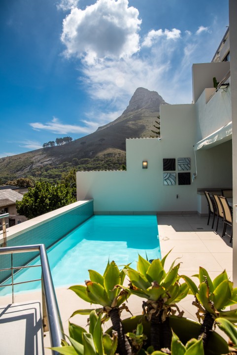 Resting on the slopes of Table Mountain with breathtaking views of the ocean and twelve apostles, this luxurious villa is split over two levels and offers an entertainment bar, heated pool and is decorated in calming, neutral hues.