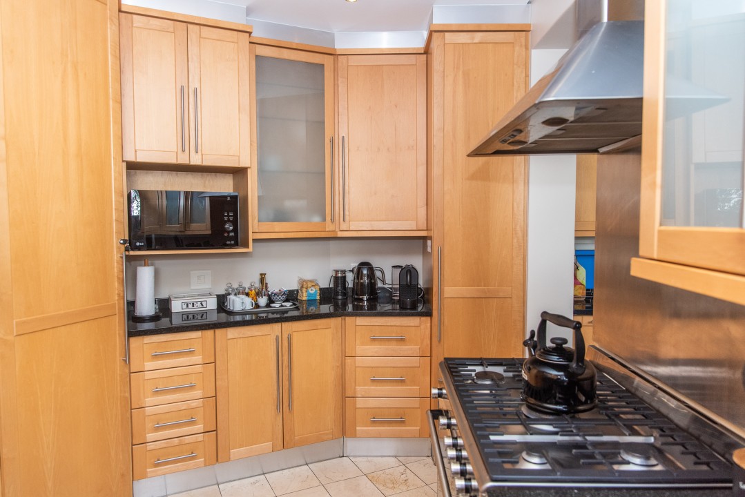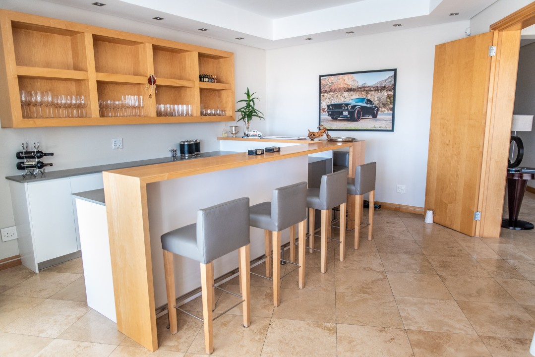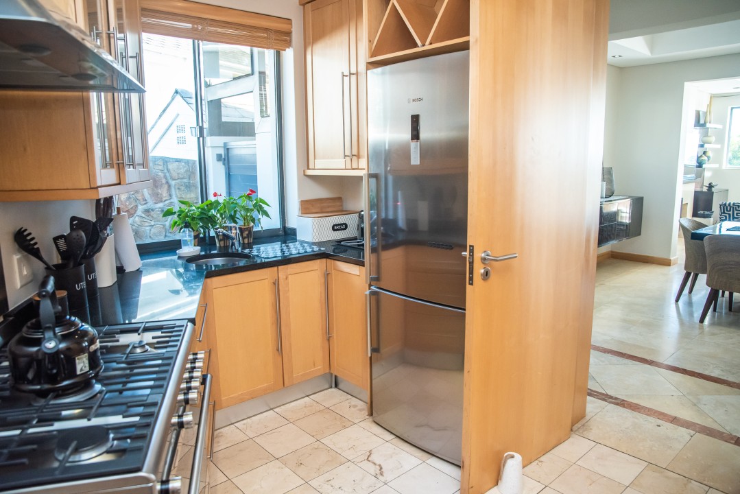 An open-plan living and dining room adjoins the bar area on the lower level and both areas open out onto an outdoor patio and salt water pool. This property also offers a gas fireplace in the lounge for chilly nights and a gas braai on the patio for when the weather calls you to be outdoors. The kitchen and separate scullery area are fully furnished with all the appliances and equipment you could need at your home away from home.