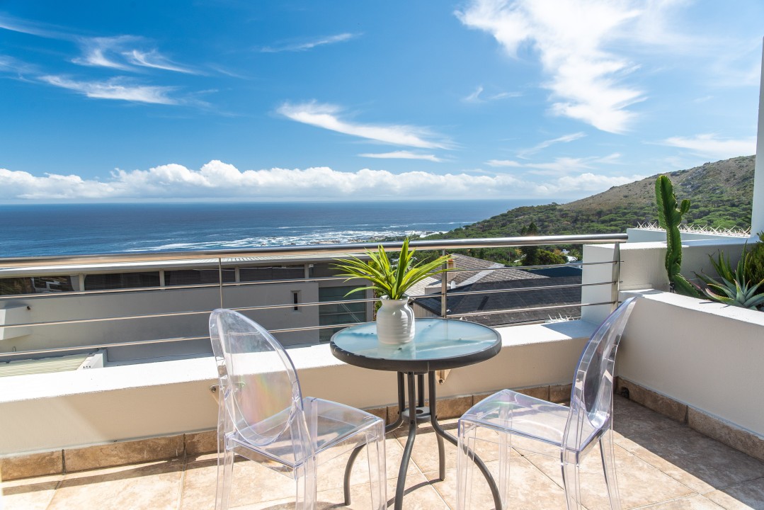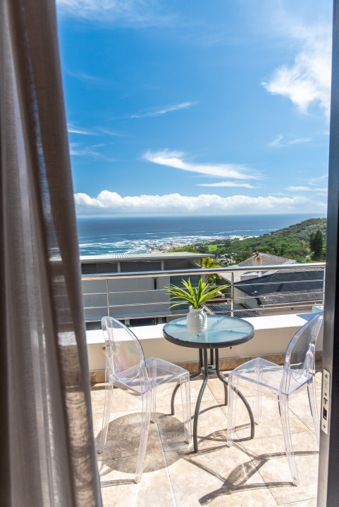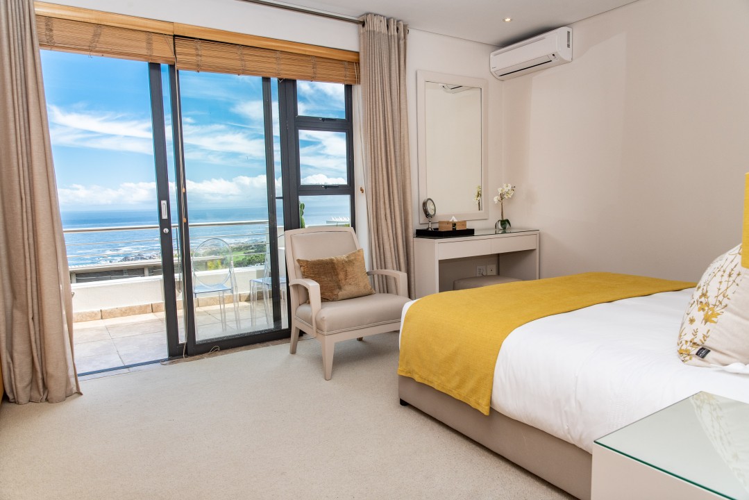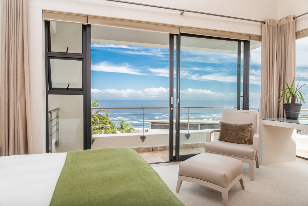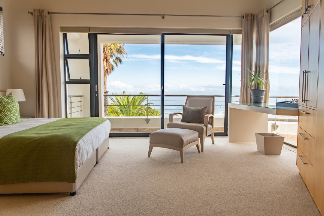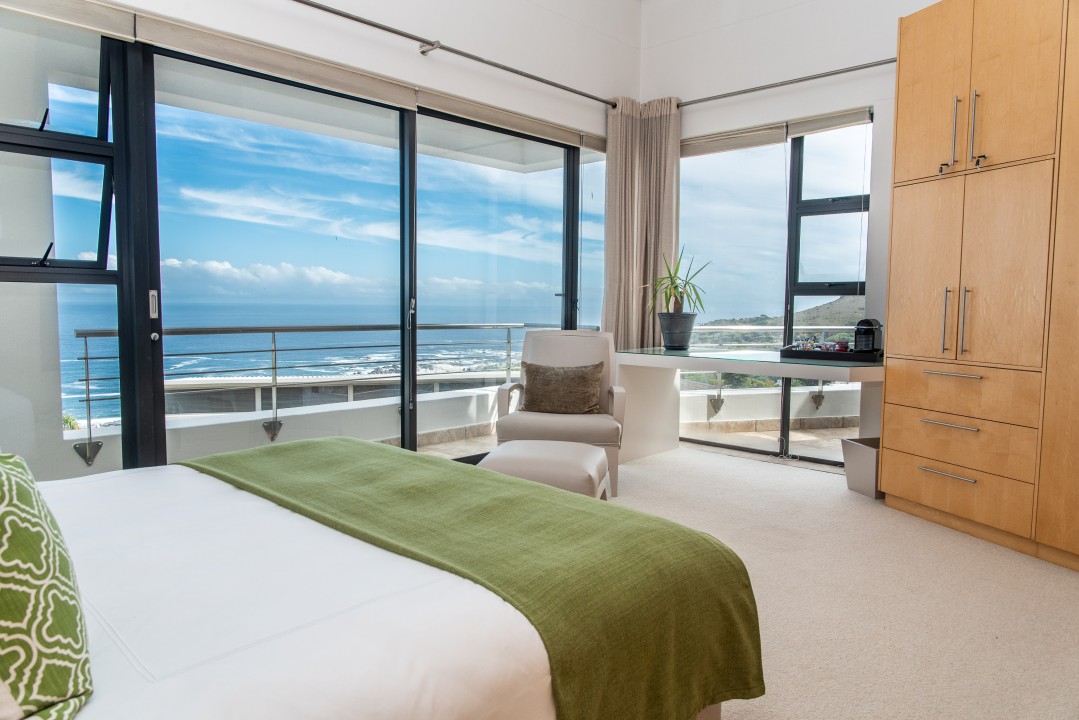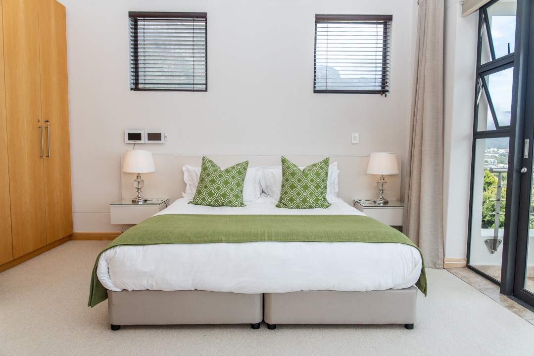 There are four air-conditioned bedrooms, all with ensuite bathrooms and extra-length kingsize beds. Three bedrooms are located on the upper level and one on the lower level. There are balconies on either side of the property accessed from the bedrooms. Two bedrooms face towards the Atlantic Ocean and the other two face towards Table Mountain. All bedrooms offer hotel-quality beds, linen, hairdryers, and safes. There is an additional guest bathroom with a shower on the pool level for convenience.