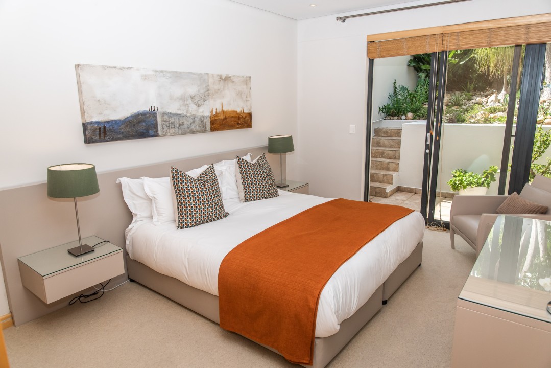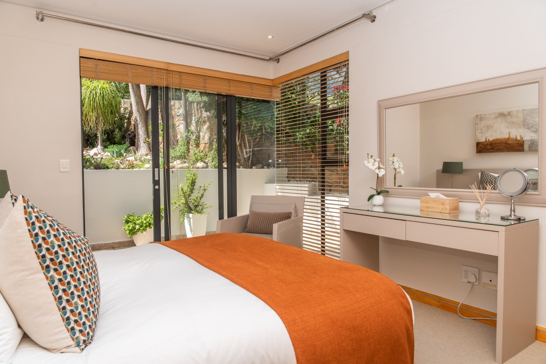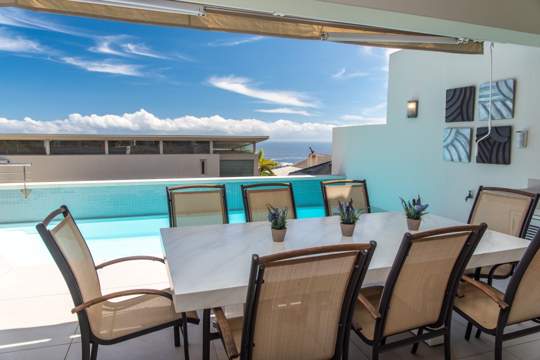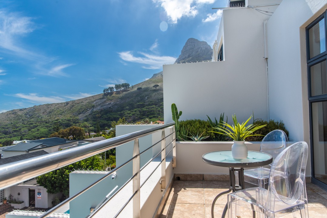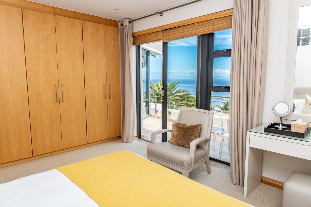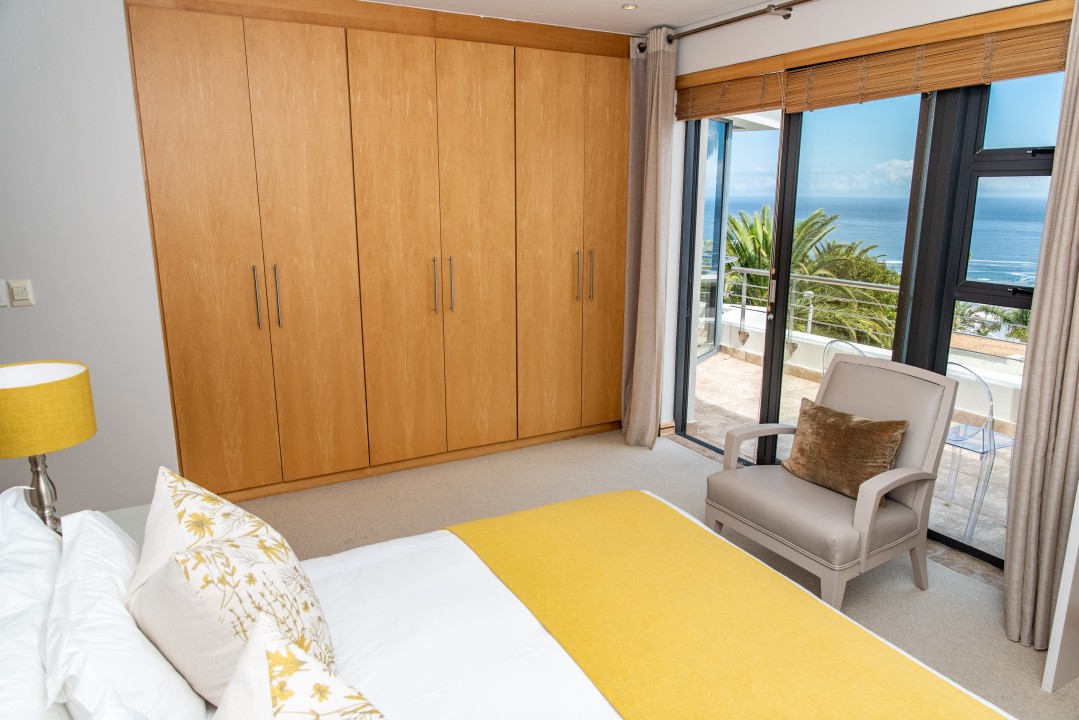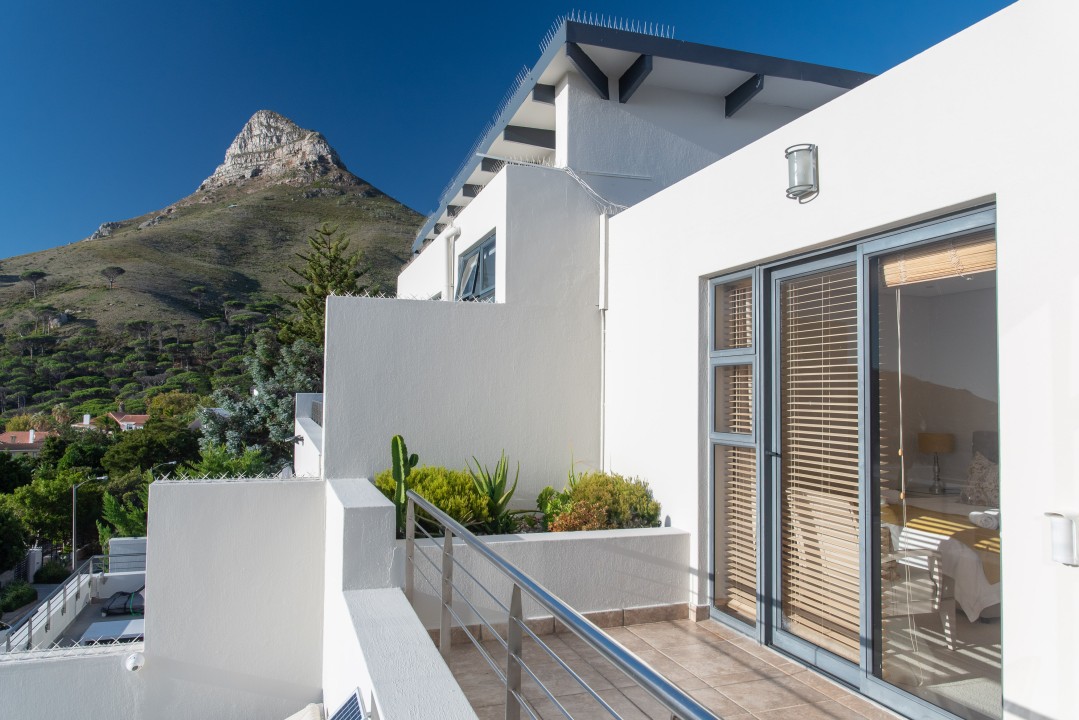 There are four air-conditioned bedrooms, all with ensuite bathrooms and extra-length kingsize beds. Three bedrooms are located on the upper level and one on the lower level. There are balconies on either side of the property accessed from the bedrooms. Two bedrooms face towards the Atlantic Ocean and the other two face towards Table Mountain. All bedrooms offer hotel-quality beds, linen, hairdryers, and safes. There is an additional guest bathroom with a shower on the pool level for convenience.