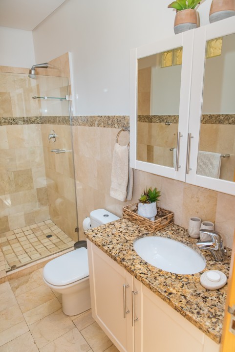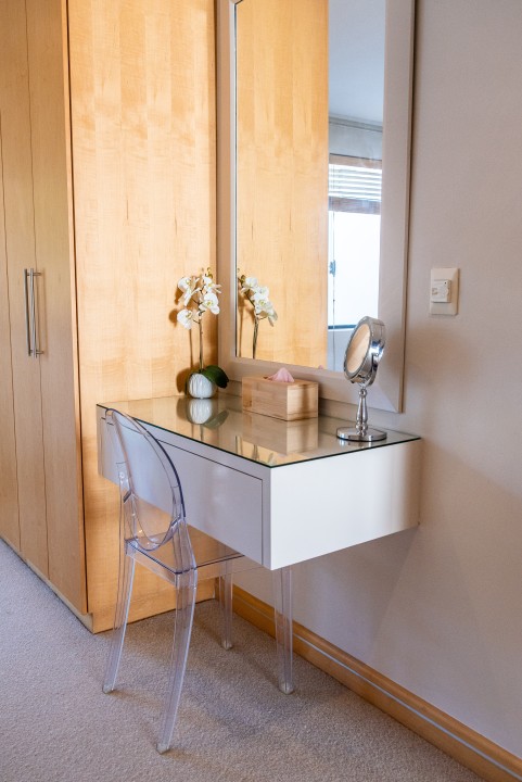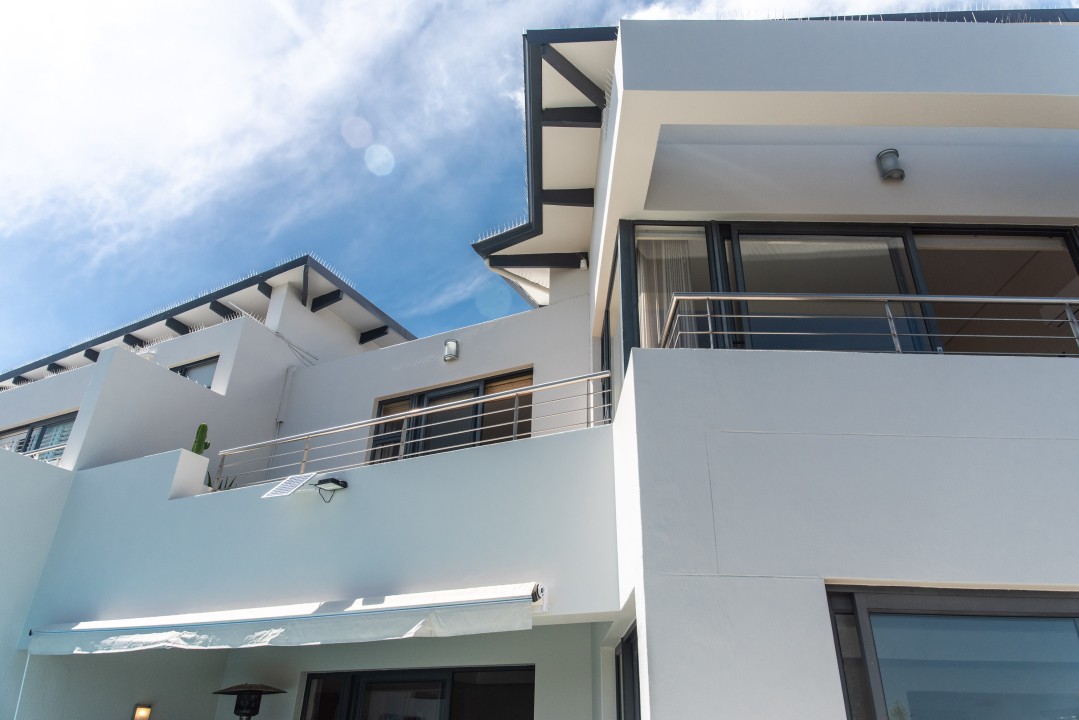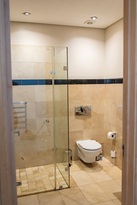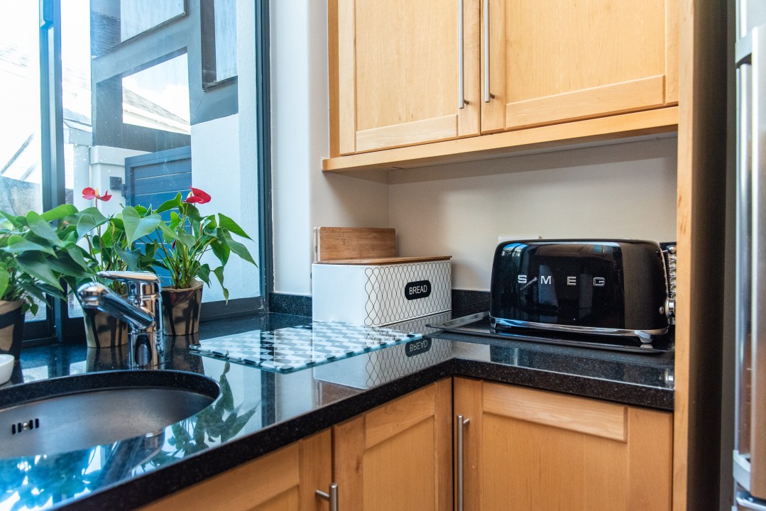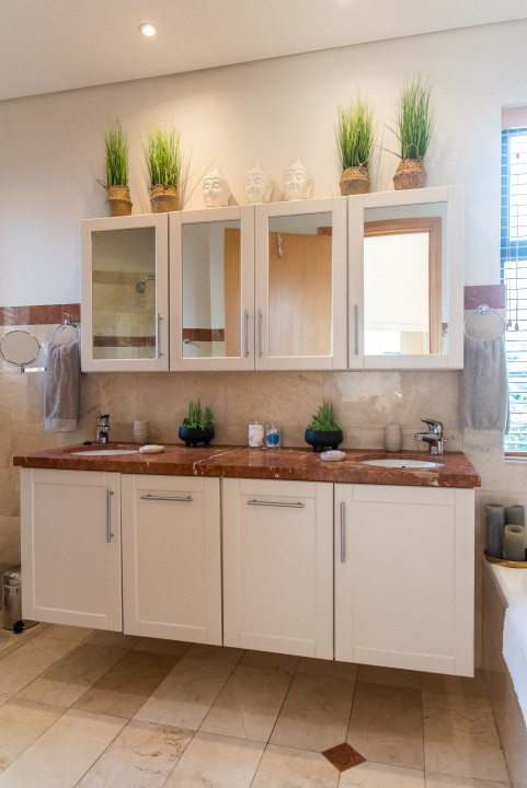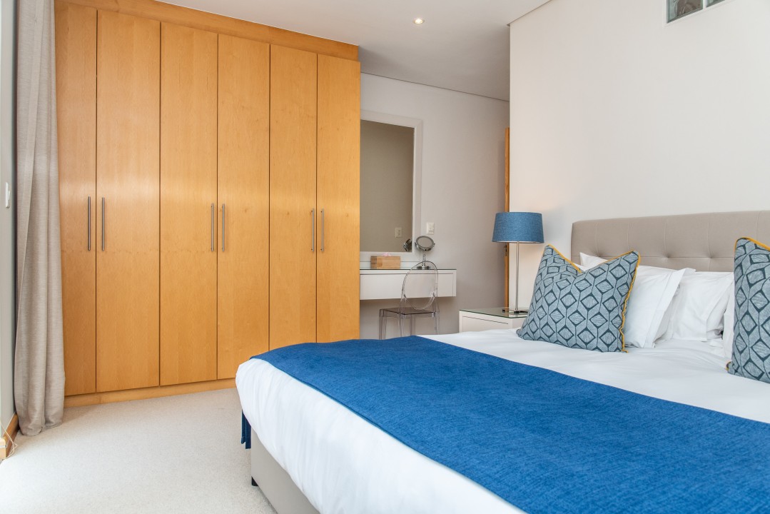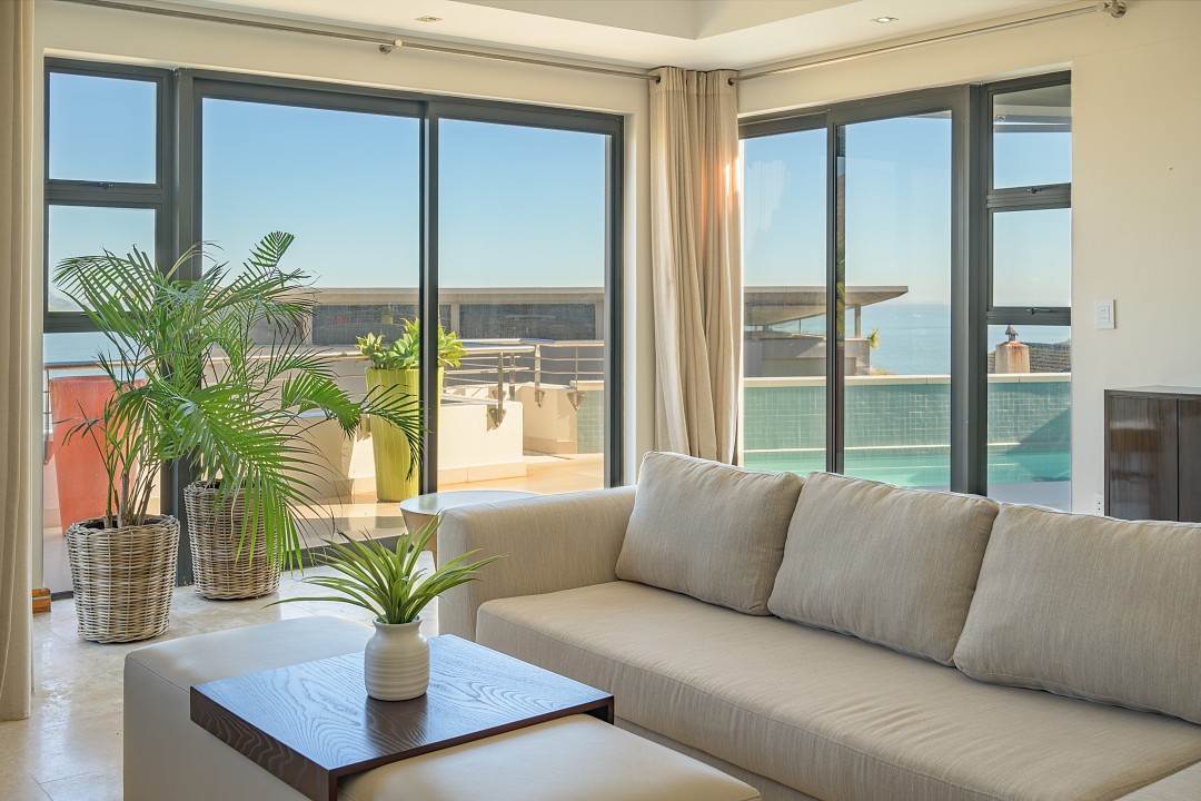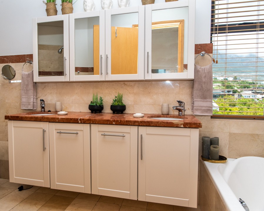 There are four air-conditioned bedrooms, all with ensuite bathrooms and extra-length kingsize beds. Three bedrooms are located on the upper level and one on the lower level. There are balconies on either side of the property accessed from the bedrooms. Two bedrooms face towards the Atlantic Ocean and the other two face towards Table Mountain. All bedrooms offer hotel-quality beds, linen, hairdryers, and safes. There is an additional guest bathroom with a shower on the pool level for convenience.