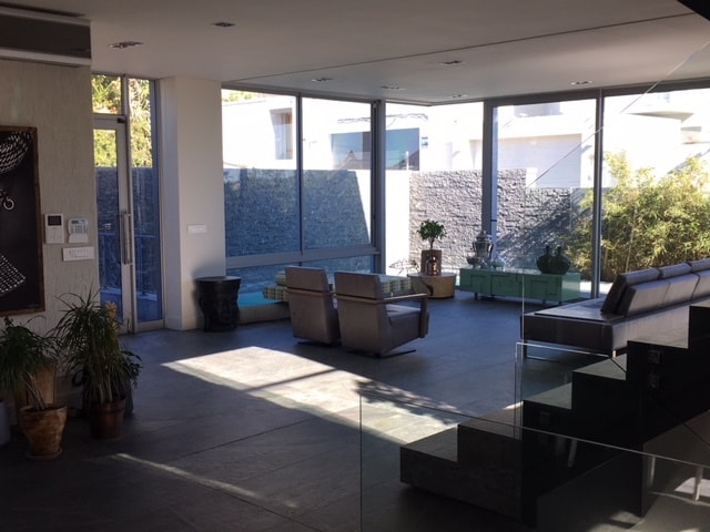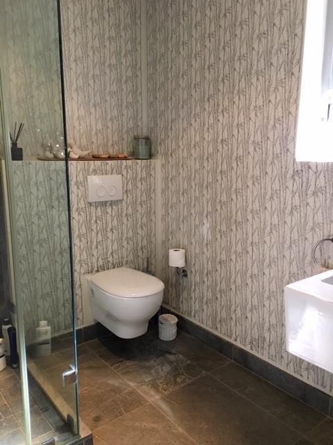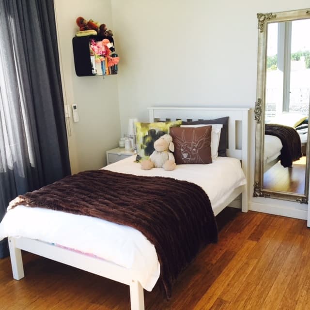 The exposed glass and granite staircase leads up to the second and top floor. Here the master bedroom en-suite (shower only) and two additional bedrooms (one single and the other twin/double) enjoy views of the Lions Head mountain. A full family bathroom serves the two bedrooms. There is a small open work space on the landing.