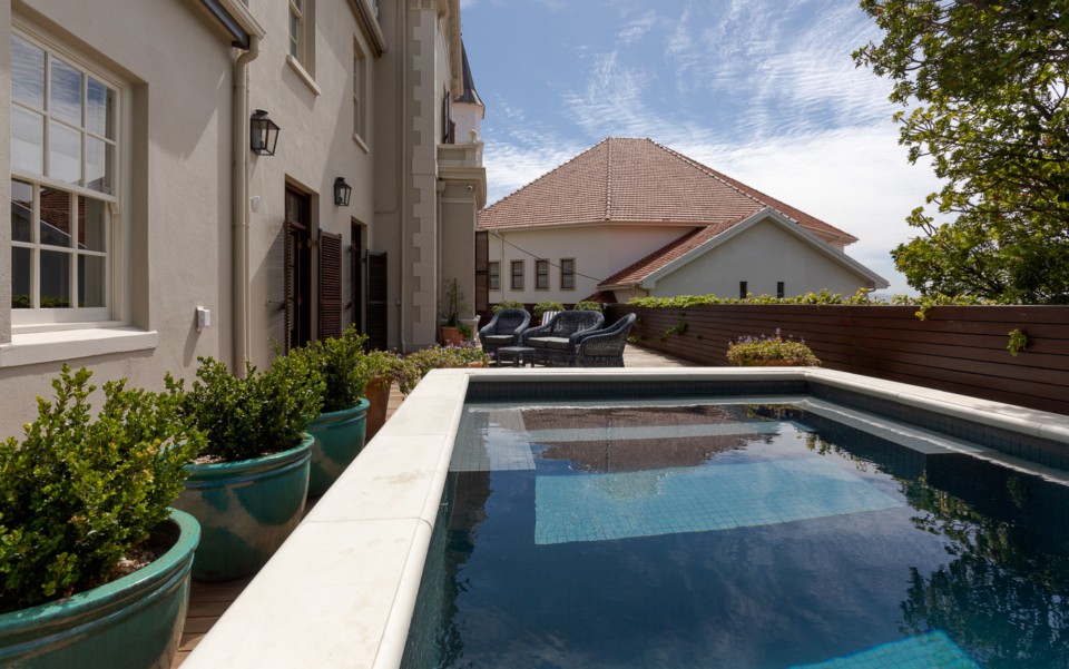 - Pool patio with lounger seating, sun loungers and splash pool, table mountain views