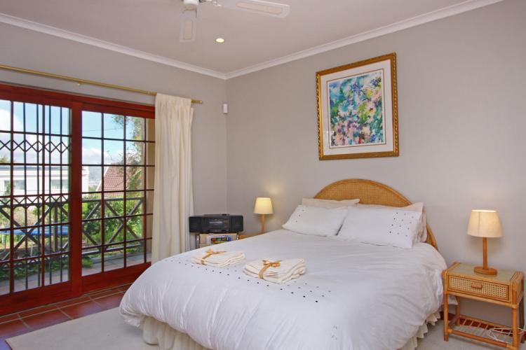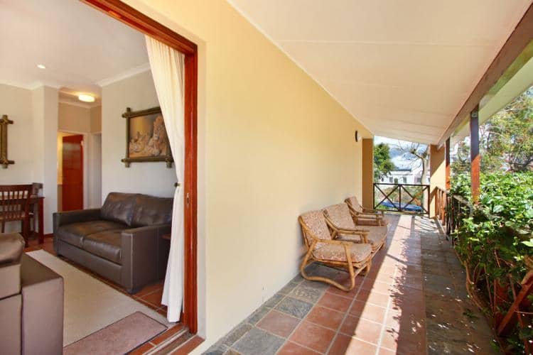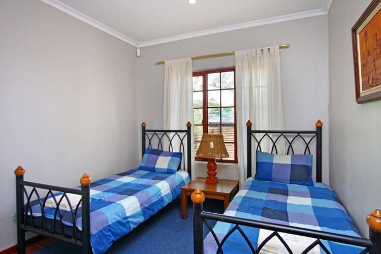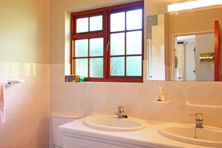 Helderberg Cottage features two bedrooms, the main bedroom with an extra length queen size bed and the second bedroom with twin beds. The main bedroom slides open onto the private balcony which overlooks the garden with a trampoline. There is a separate bathroom with shower and twin basins.