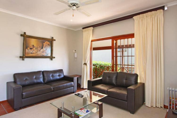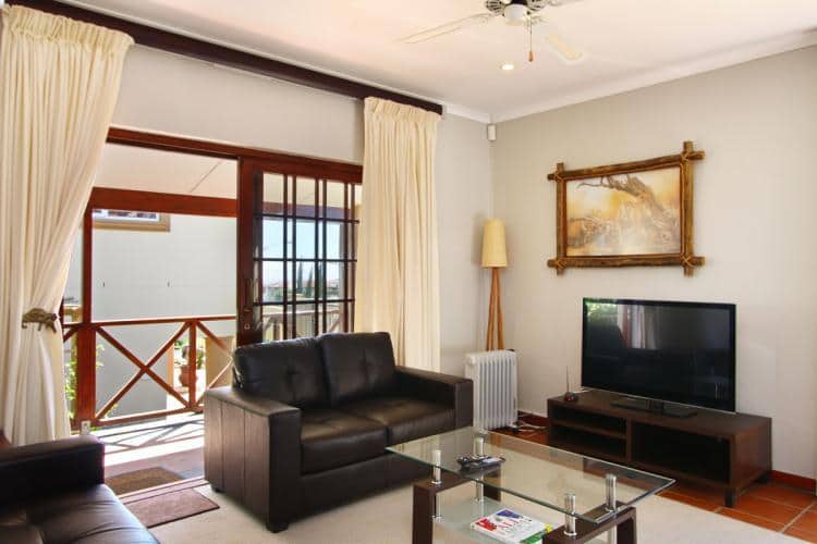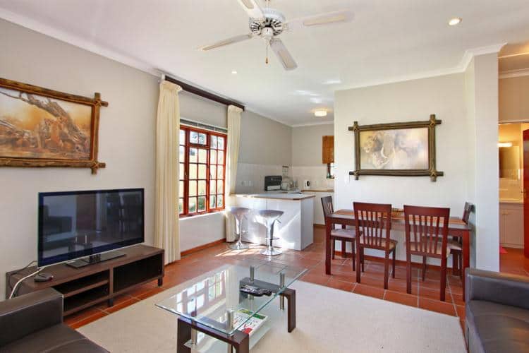The lounge contains a comfortable double sleeper couch and an additional leather couch with a flat screen TV with full satellite (DSTV) and a dining room table with 4 chairs. There are also another 2 chairs at the kitchen counter.