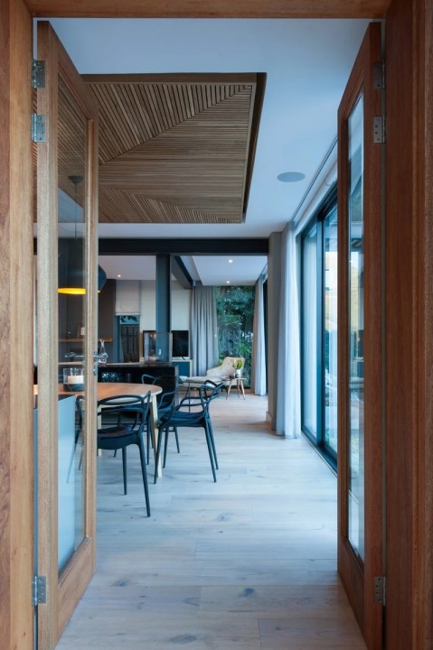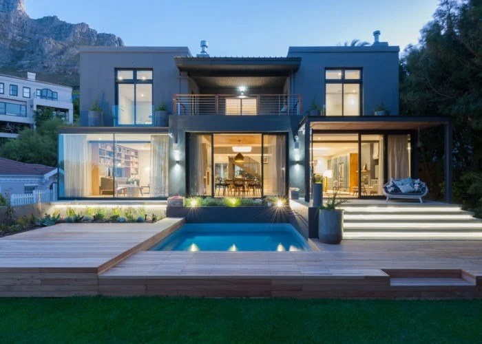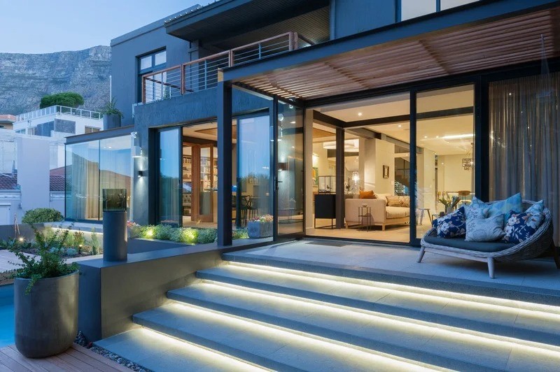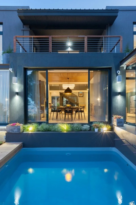 In front of the house is a natural green belt zone with large protected European pines on a natural water cause area where you’re greeted with uninterrupted views of Table Bay and the City Bowl through the trees.