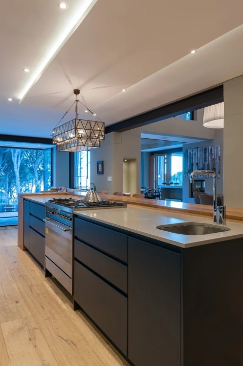 The stylish kitchen is designed for interactive meal preparation with counter tops that are a chef’s dream in terms of preparation space. Plus the chef is served up with a breathtaking view as the kitchen looks out over the lounge and beyond to city and Table Bay. Counter tops can double up as serving areas when entertaining, while the large windows slide completely open to create a bar service area to the sheltered rear terrace.