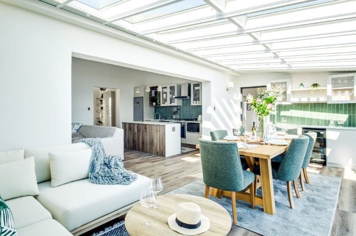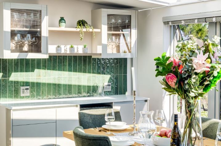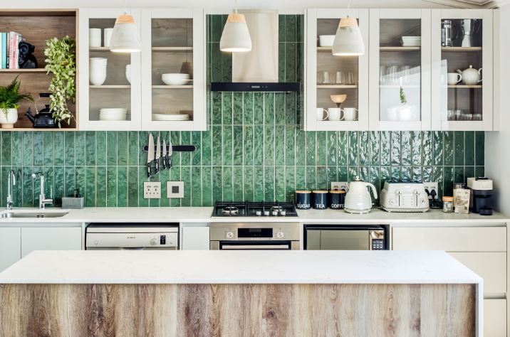 The sleek, modern kitchen is fully equipped for effortless self-catering.