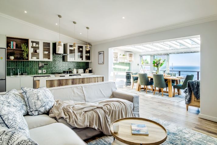The open-plan living and dining area is designed for both relaxation and entertaining, framed by uninterrupted ocean views.