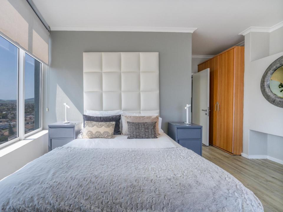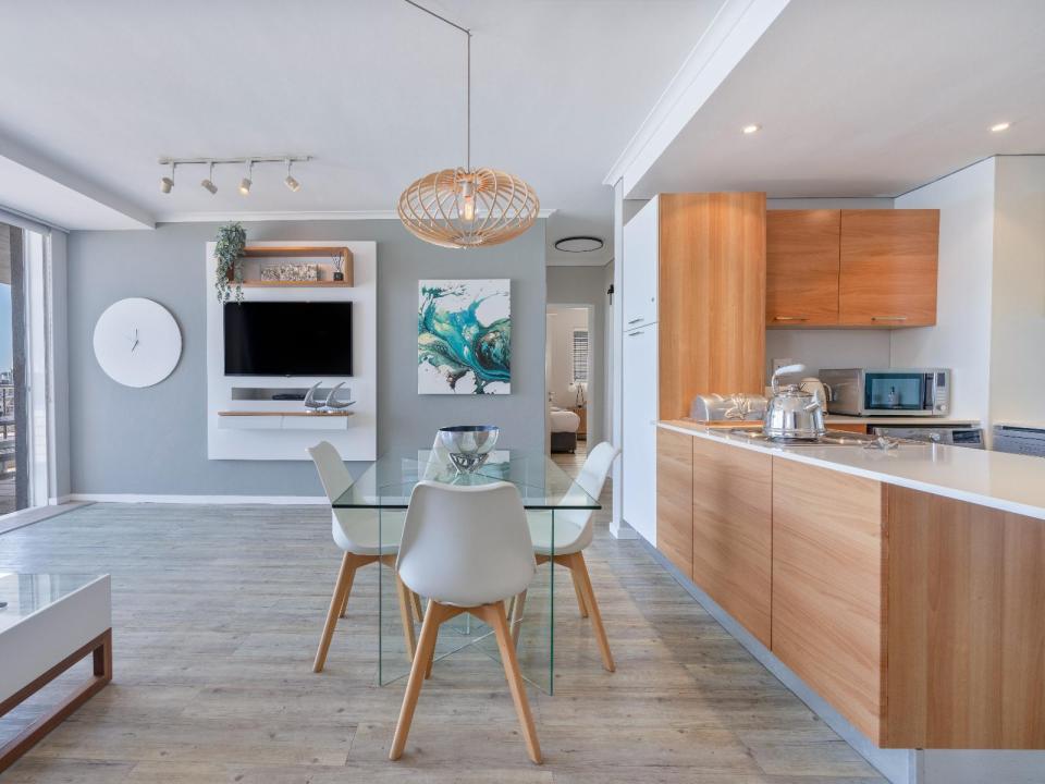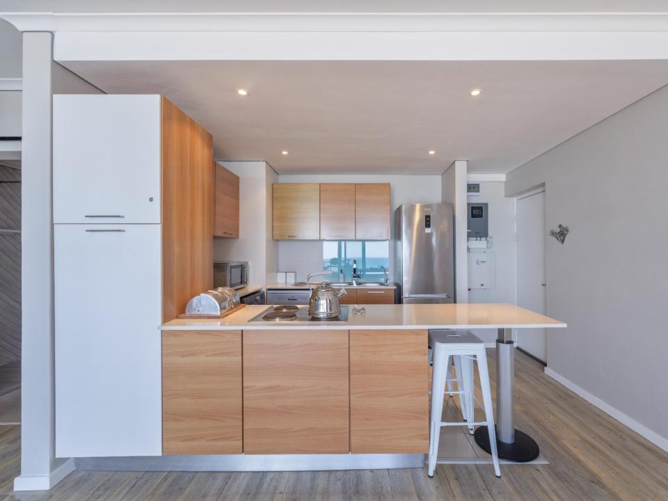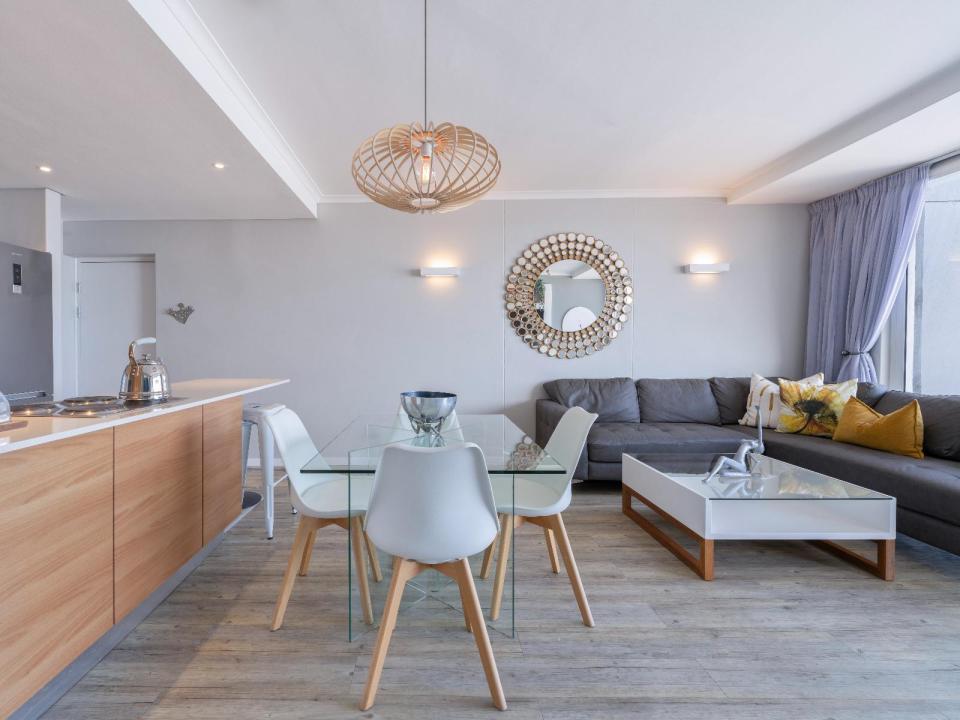The comfortable lounge leads out onto a patio where guests can enjoy stunning panoramic views of the Atlantic Ocean and Robben Island and is equipped with a gas braai. Relax around the swimming pool or take a 30 meter walk across the promenade which are in front of the apartment block to the main beach, a surfer, stand up board paddler and kite surfer’s paradise. Surrounded with top restaurants, coffee shops and pubs.