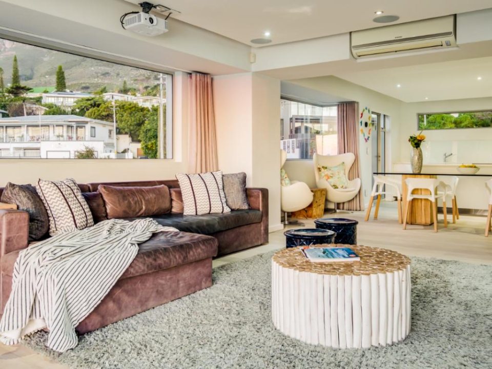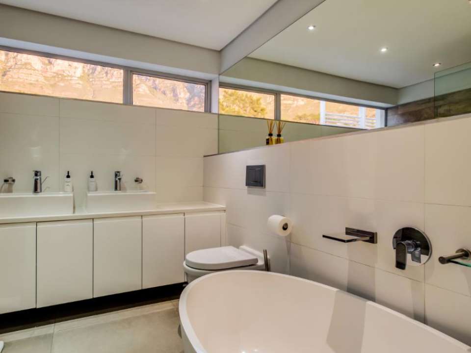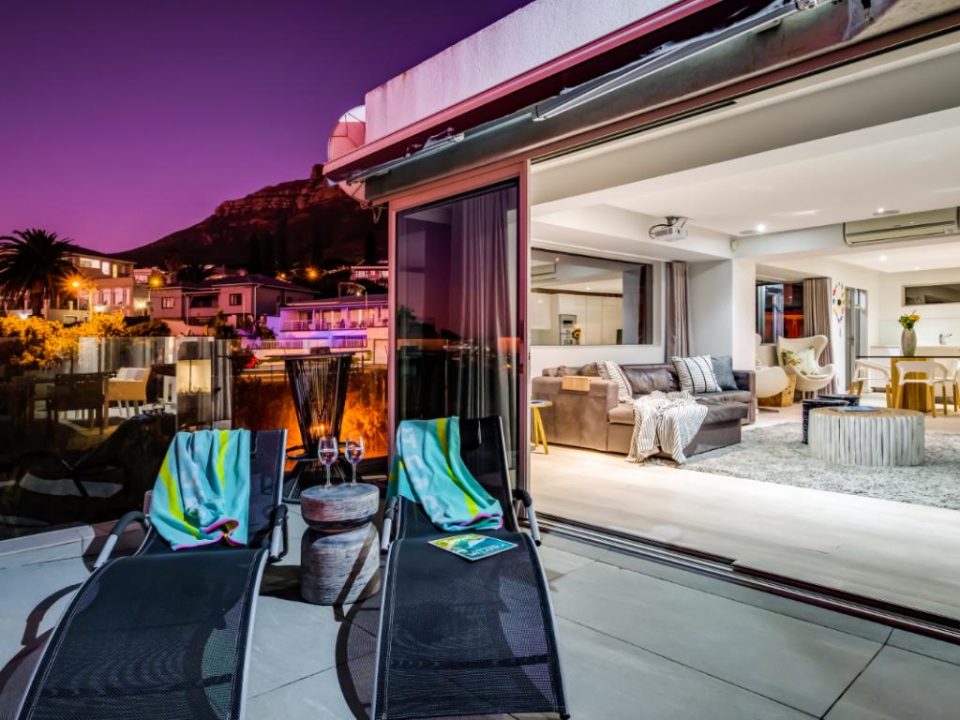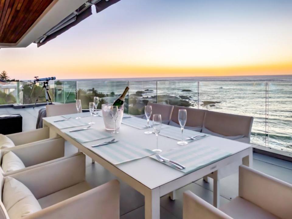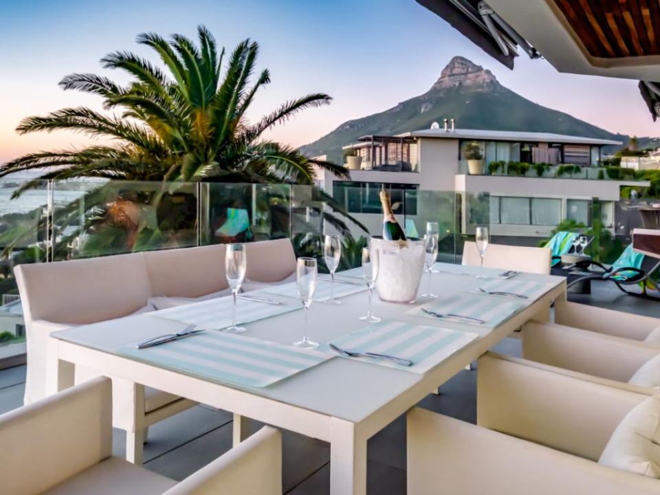 Three bedrooms are elegantly decorated in natural hues, with crisp white linen and concealed cupboards. Opening onto the terrace with stunning sea views, the master bedroom boasts a king-sized bed, a spacious en-suite bathroom with a deluxe oval bathtub and large rain shower, and air-conditioning for added comfort. The remaining two bedrooms are equally as luxurious with access to the terrace through large sliding doors, twin beds, and lovely views. These two bedrooms share a well-appointed bathroom with a shower and bath. All rooms open out onto a wide, tiled terrace with magnificent views. A chic outdoor lounge, gas barbeque and dining table for eight people which is ideal for summer evening entertaining, sun loungers are perfect for relaxing and soaking up the views. A cosy, sheltered courtyard off the kitchen is home to a sparkling swimming pool. The apartment is fully secure with an alarm and offers off-street parking in the form of a private parking bay, as well as three visitor’s bays. A short drive will take you to the beautiful beaches of Camps Bay and Clifton, as well as Table Mountain and the city centre.
