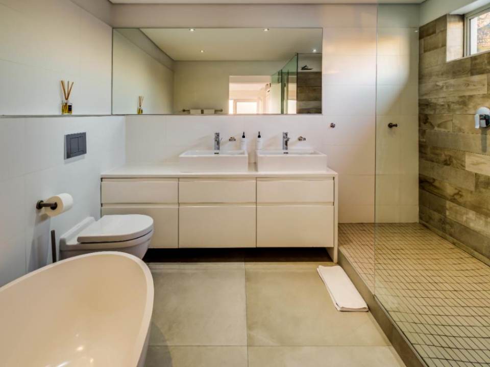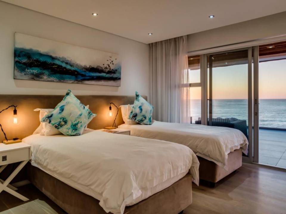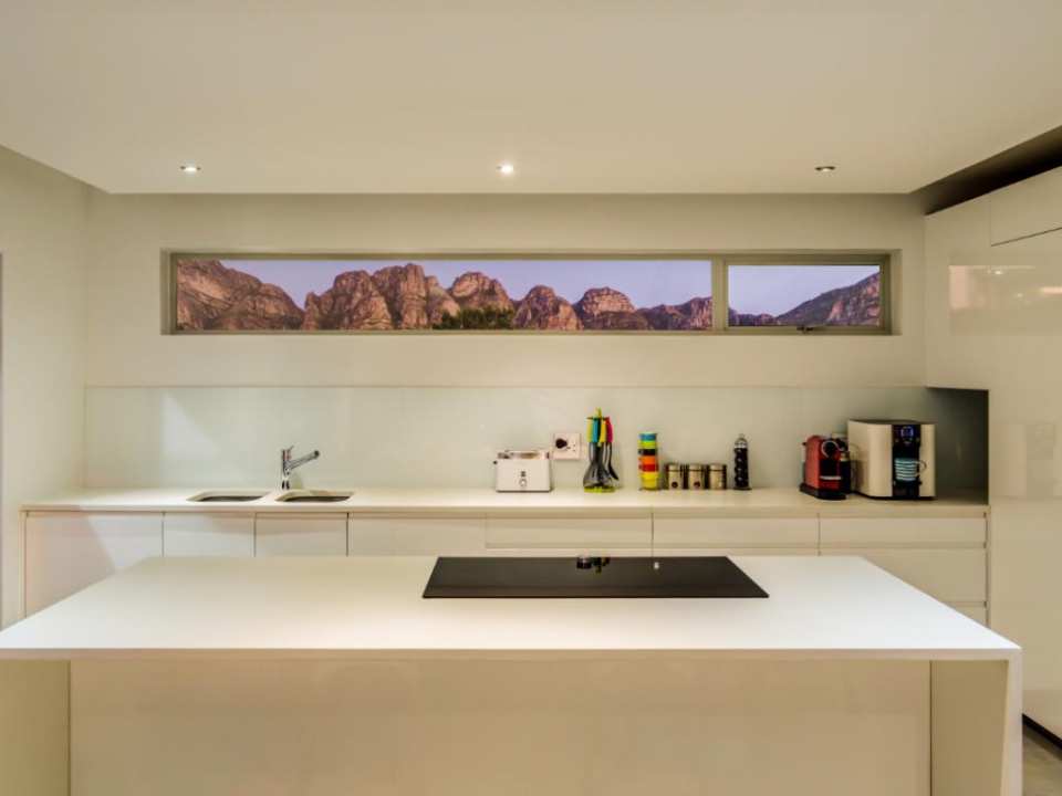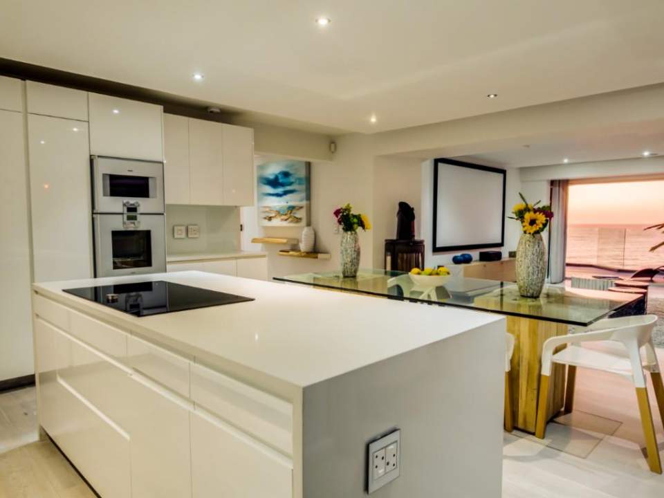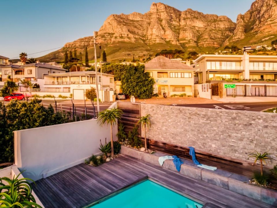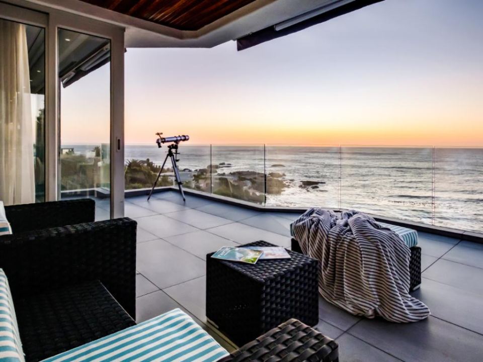 Three bedrooms are elegantly decorated in natural hues, with crisp white linen and concealed cupboards. Opening onto the terrace with stunning sea views, the master bedroom boasts a king-sized bed, a spacious en-suite bathroom with a deluxe oval bathtub and large rain shower, and air-conditioning for added comfort. The remaining two bedrooms are equally as luxurious with access to the terrace through large sliding doors, twin beds, and lovely views. These two bedrooms share a well-appointed bathroom with a shower and bath. All rooms open out onto a wide, tiled terrace with magnificent views. A chic outdoor lounge, gas barbeque and dining table for eight people which is ideal for summer evening entertaining, sun loungers are perfect for relaxing and soaking up the views. A cosy, sheltered courtyard off the kitchen is home to a sparkling swimming pool. The apartment is fully secure with an alarm and offers off-street parking in the form of a private parking bay, as well as three visitor’s bays. A short drive will take you to the beautiful beaches of Camps Bay and Clifton, as well as Table Mountain and the city centre.