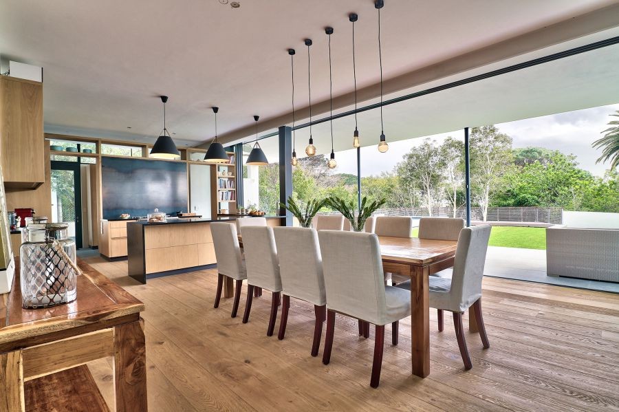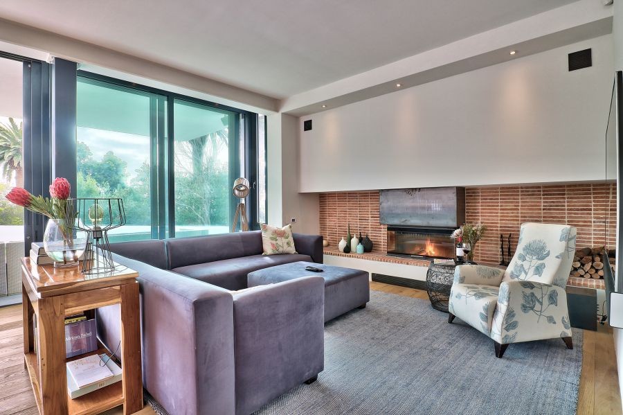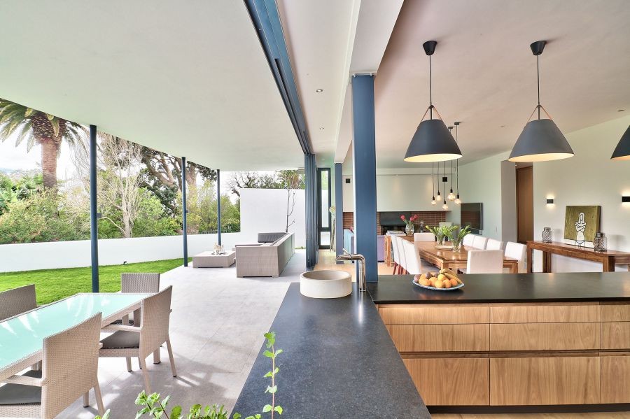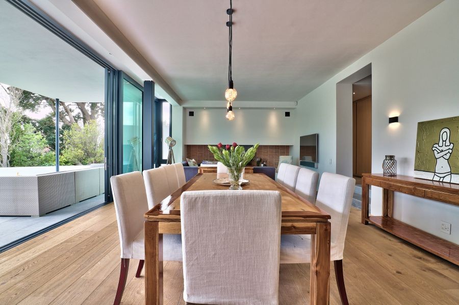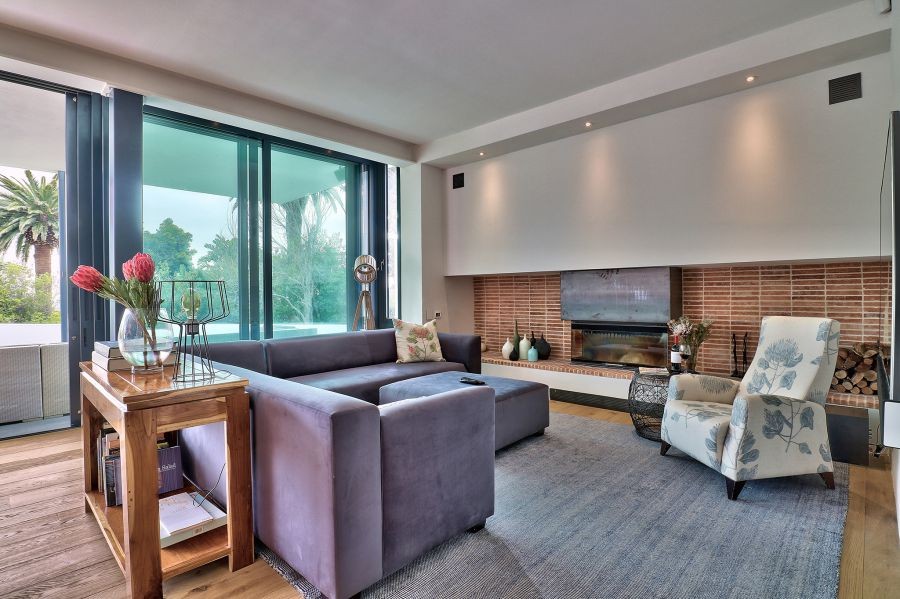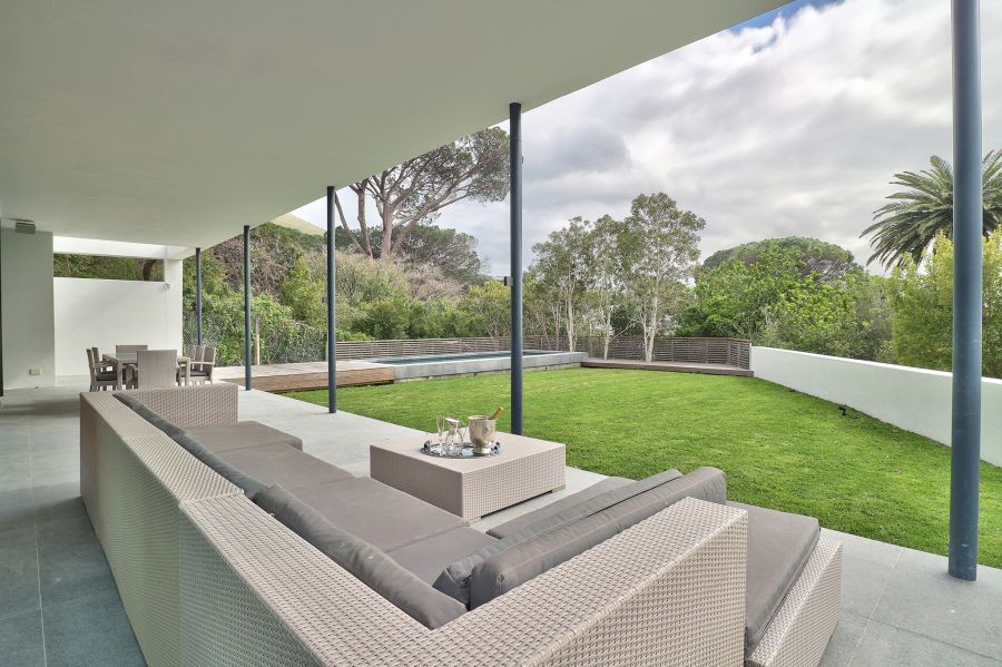 The cosy lounge area lies beyond the dining area and is furnished with comfortable couches for cosy relaxing. The indoor and outdoor living areas flow together seamlessly and spill out into the garden and the swimming pool deck beyond.