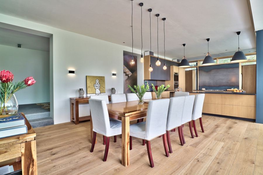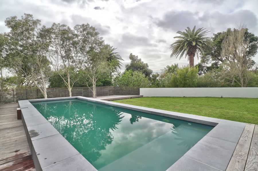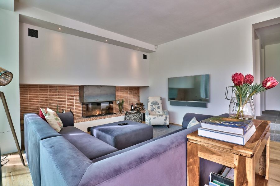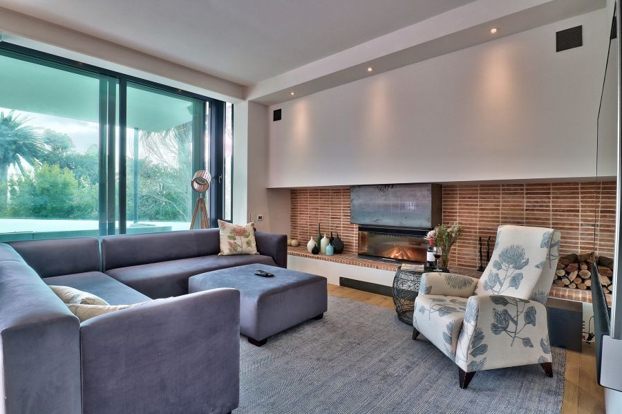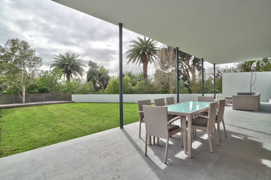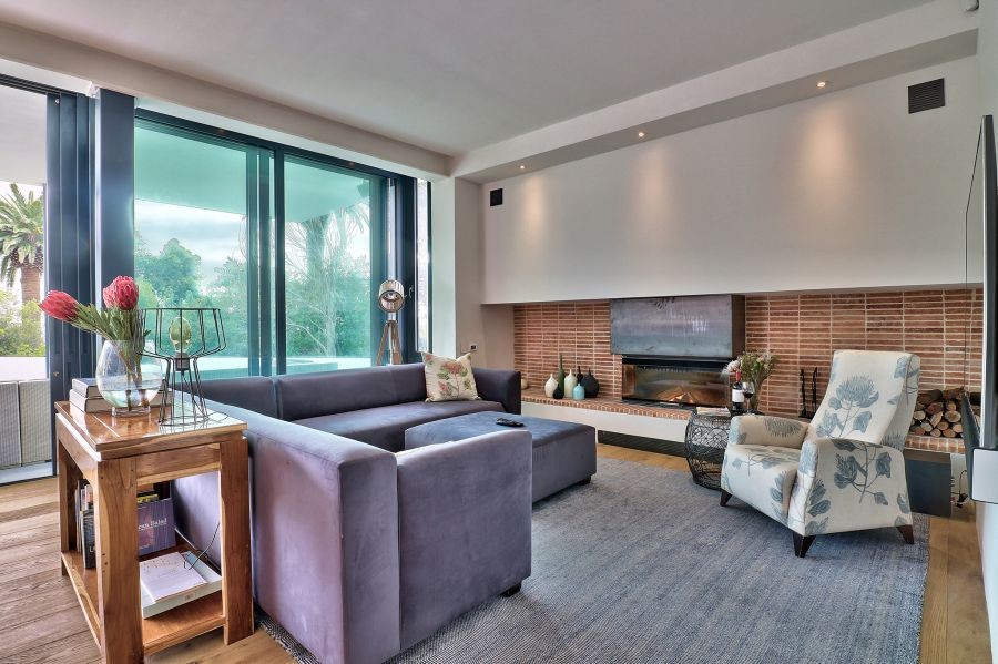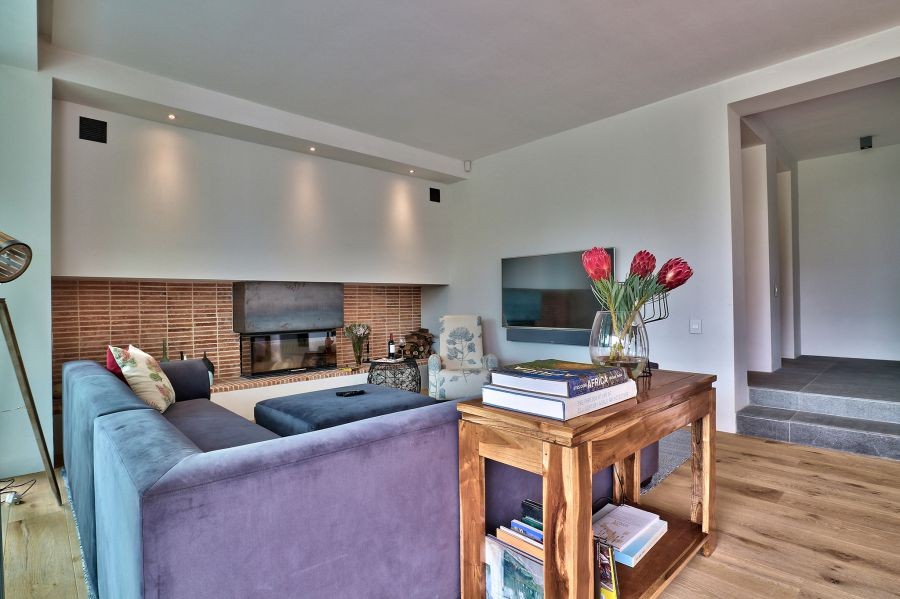 The cosy lounge area lies beyond the dining area and is furnished with comfortable couches for cosy relaxing. The indoor and outdoor living areas flow together seamlessly and spill out into the garden and the swimming pool deck beyond.