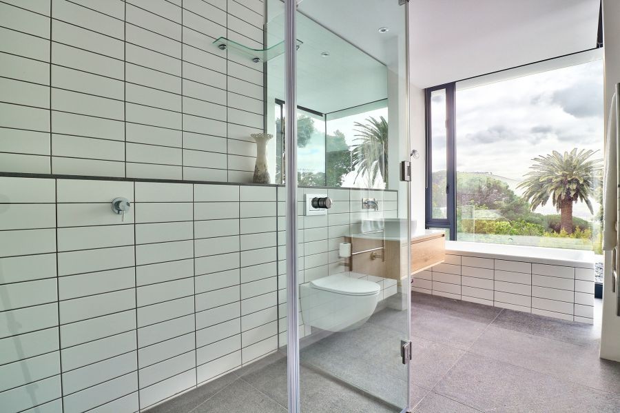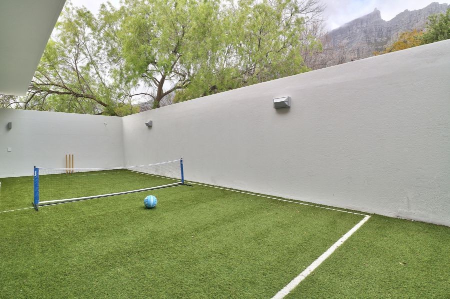 The second bedroom also has a corner position, this time with a view of Table Mountain. It is furnished with a Queen-size bed and has an en-suite bathroom with a shower. The remaining three bedrooms are on the middle entrance level, all with full en-suite bathrooms and doors opening on to a terrace. Two are furnished with Double four poster beds and one with a Queen-sized bed. There is also a TV and reading lounge on this level leading out to an enclosed astroturf sport courtyard where hours of tennis and soccer can be enjoyed.