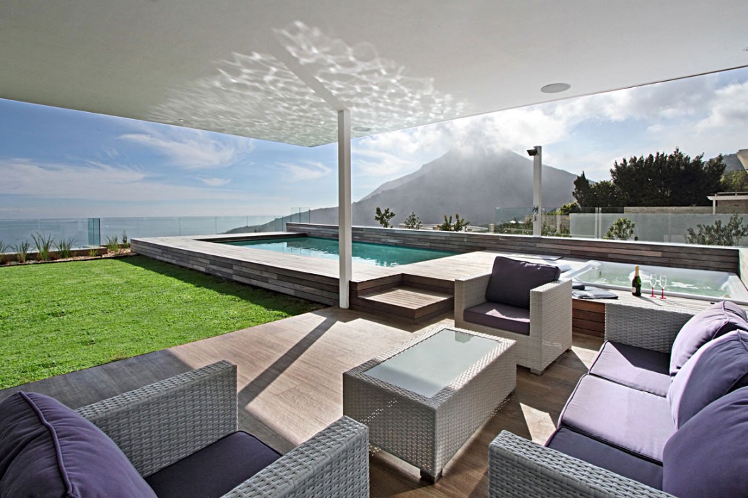 The living pavilion has a double volume ceiling and all folding doors open up onto the outside living area. An Assirelli kitchen, 10 seater dining table and a couch seating area complete the living area that offers uninterrupted views of Lions Head and the 12 Apostles, Camps Bay beach and out over the sea.