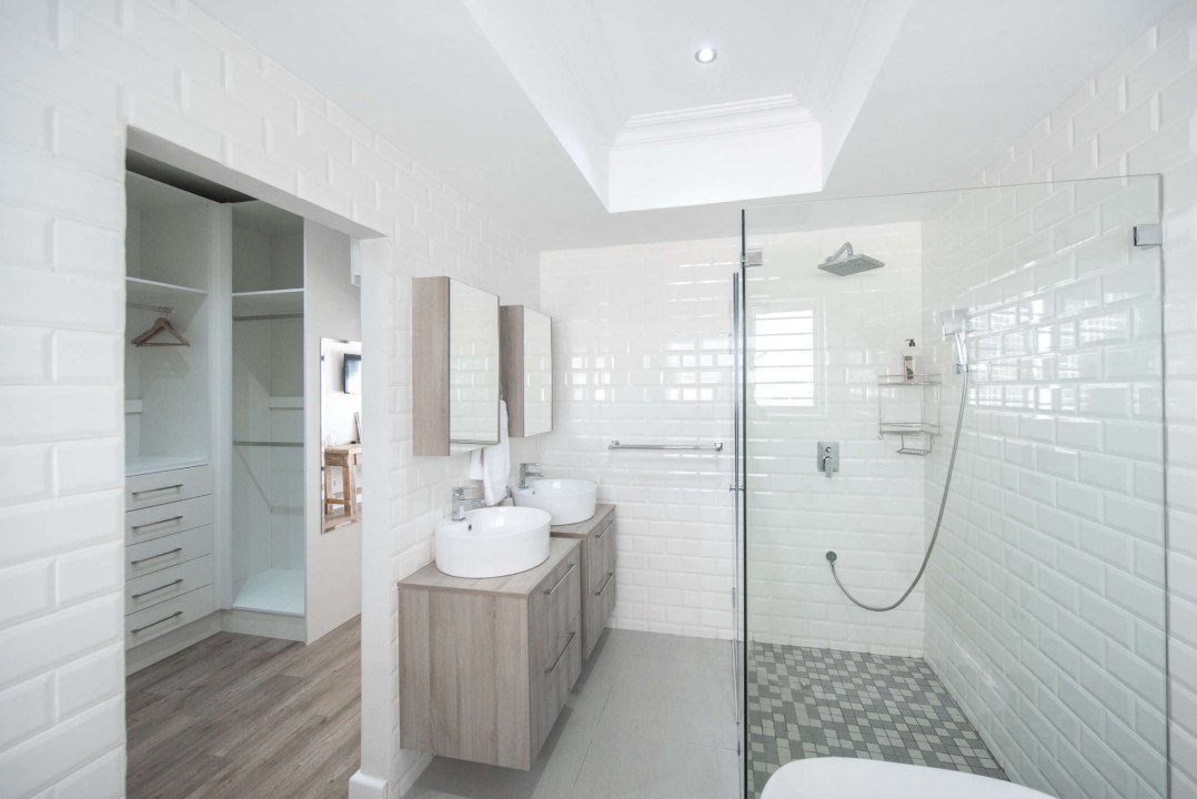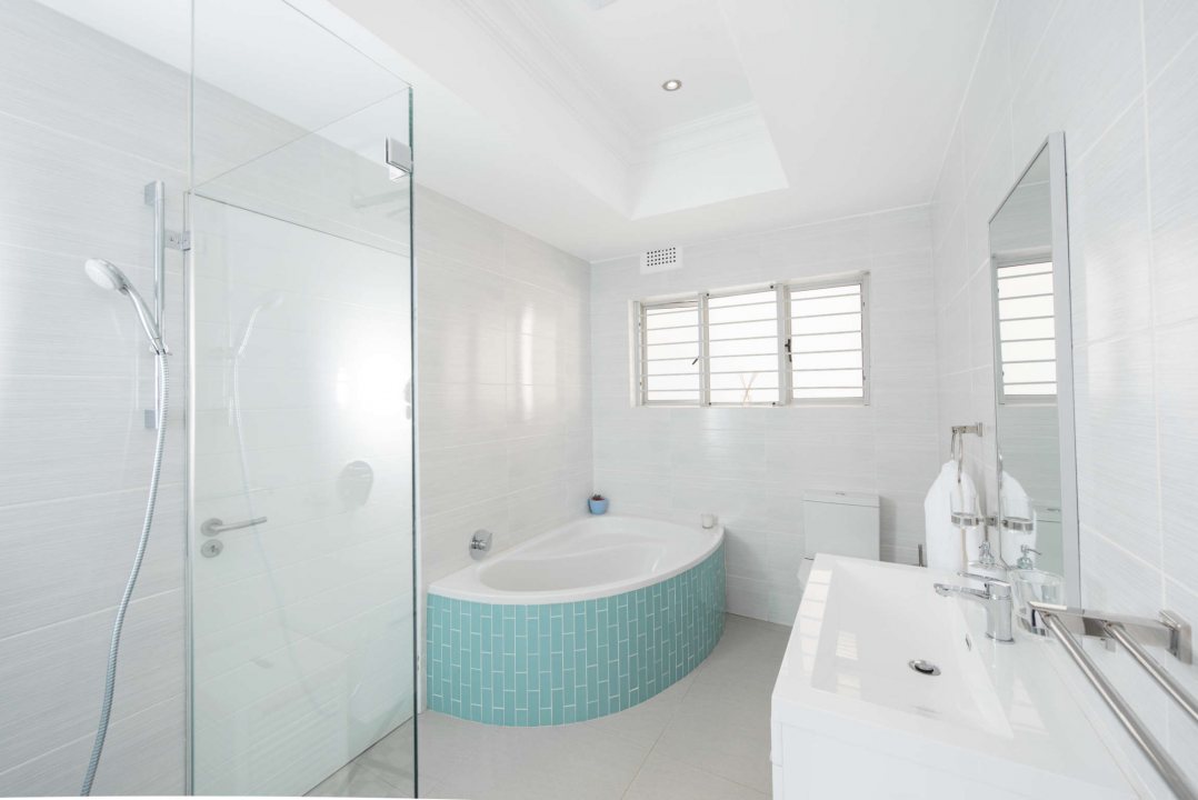 The Master bedroom has a king size bed and its very own private walk in dressing room with ample wardrobes, as well as its own luxurious bathroom with a very roomy shower and tub. Bedroom 2 and 3 both have comfortable queen size beds and built in wardrobes. Guest bedrooms share a second bathroom with shower and tab, and each have their own entry doors.