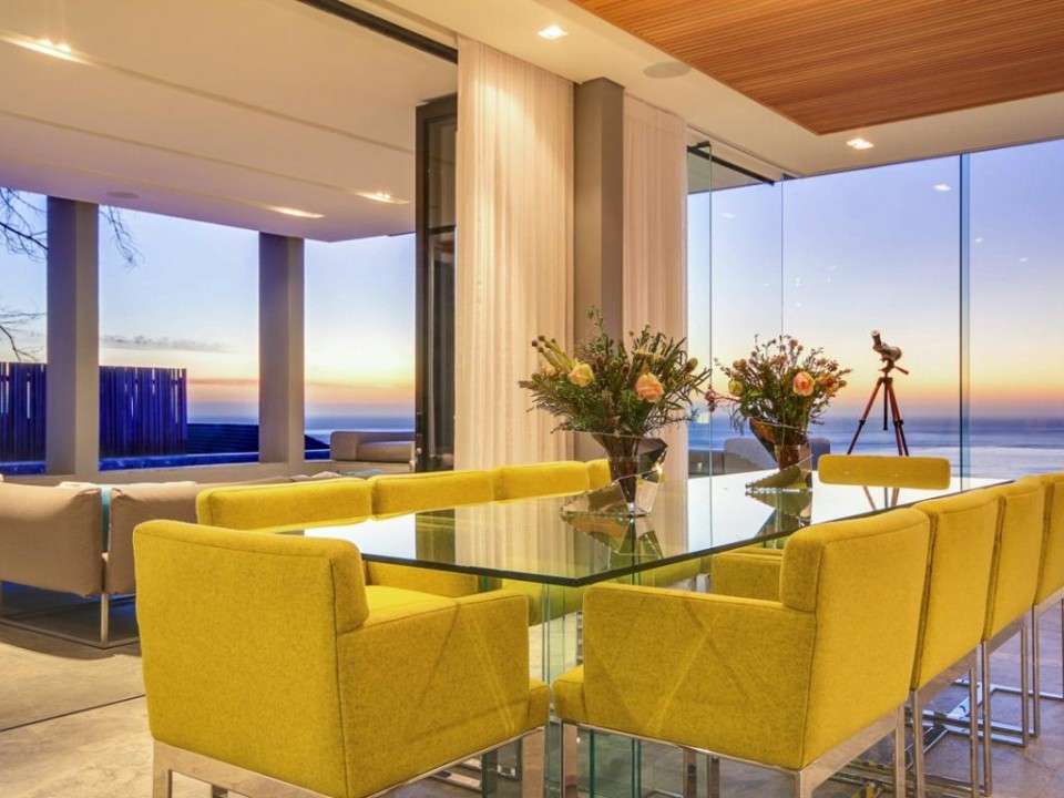 On the top floor, there is a covered patio lounge for enjoying sundowners in the evening. Those who enjoy cooking will love the modern kitchen, which is fully equipped with top-of-the-range appliances. It has a central island with a breakfast bar and a separate scullery. Open plan to the kitchen is a lovely bright dining area with seating for 10 guests and spectacular views of the ocean.