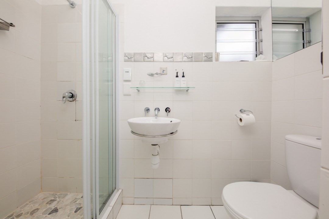 A comfortable bedroom with ensuite bathroom that shares a patio with the living room. The bathroom is ensuite and has a shower.