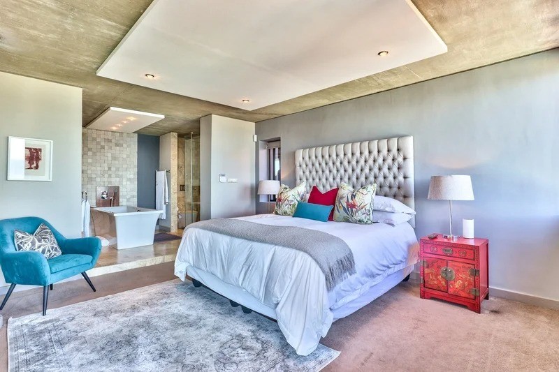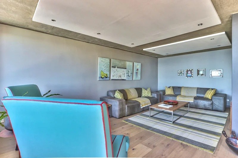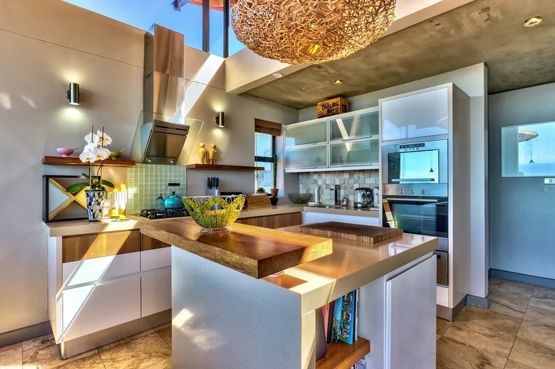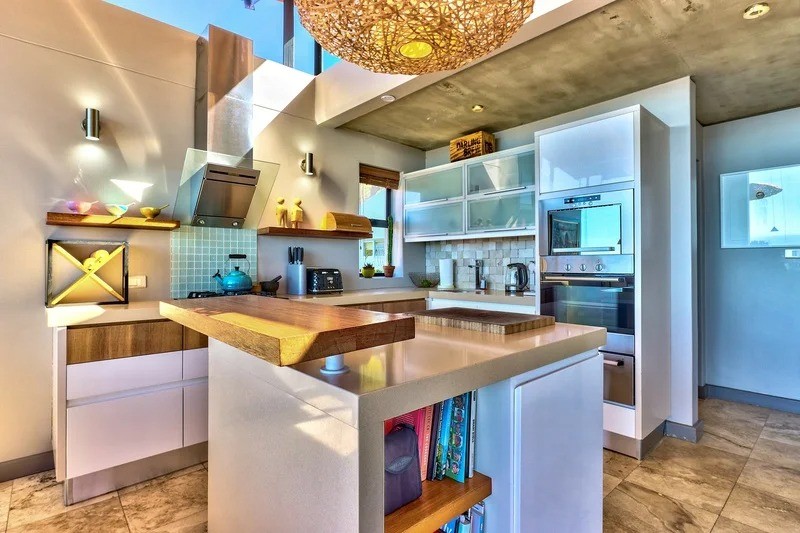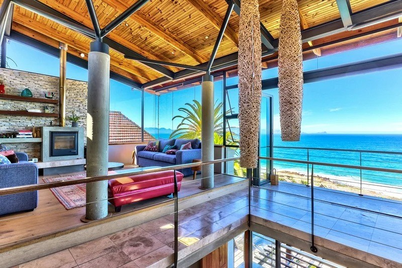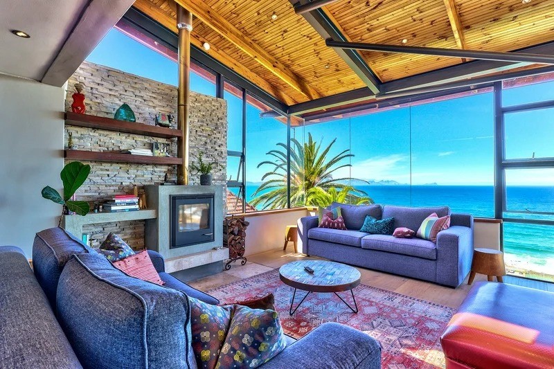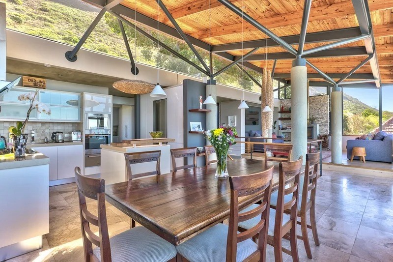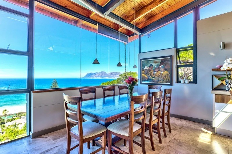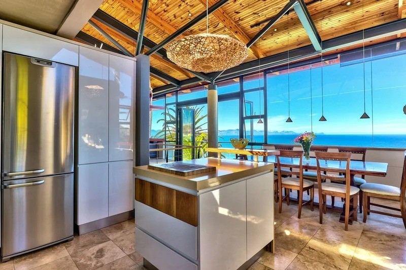 Views, views, views. Located just below scenic Boyes Drive, Jacob’s Ladder enjoys the most elevated location high above historic St James. Floor-to-ceiling glass walls encompass the mesmerizing views across False Bay, and picture windows frame the mountain behind. Cleverly designed with an articulated ceiling that creates additional volume, and minimal use of internal walls, the house is airy and filled with light, yet furnished such that each space is distinctive, welcoming, and cozy. Drawn to that enormous blue horizon, you pass an en-suite guest bedroom (the only bedroom without a sea view) to where white Weylandts lamps lengthen into the stairwell; to the left is the open lounge, furnished in a palette of blue and maroon, and warmed with convection wood-burning fireplace in winter; to the right is an open kitchen-cum-dining room. Surrounded by views, this well-equipped kitchen invites cooking and entertaining in equal measure.