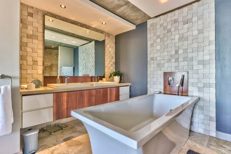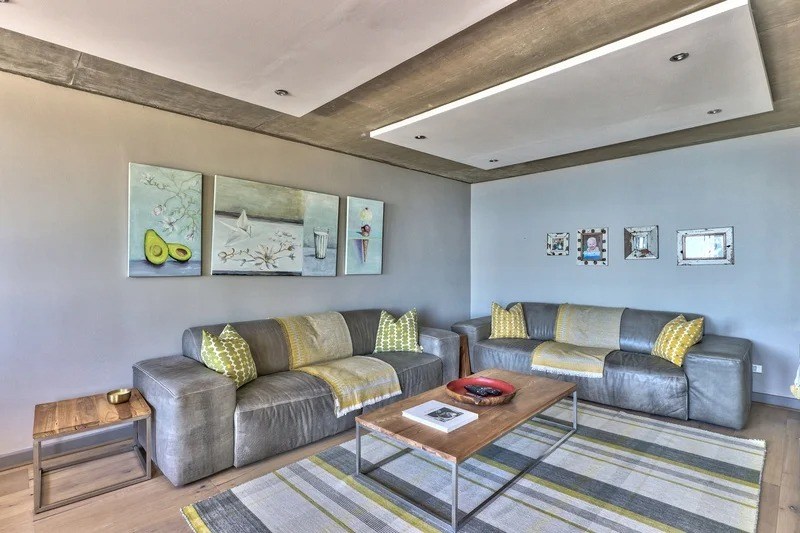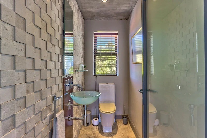 The ground floor comprises two en-suite bedrooms, each opening onto a convenient kitchenette, and the furnished pool deck. A mobile bar can be rolled out to the rim-flow pool and entertainment deck – to the east lies expansive False Bay – the timber decking is the perfect spot to salute the rising sun. In the evenings watch the sun disappear behind the looming massif that curls its way south to Cape Point, and the twinkling lights of Simonstown flicker on – a unique vantage, fringed by stone pine trees.