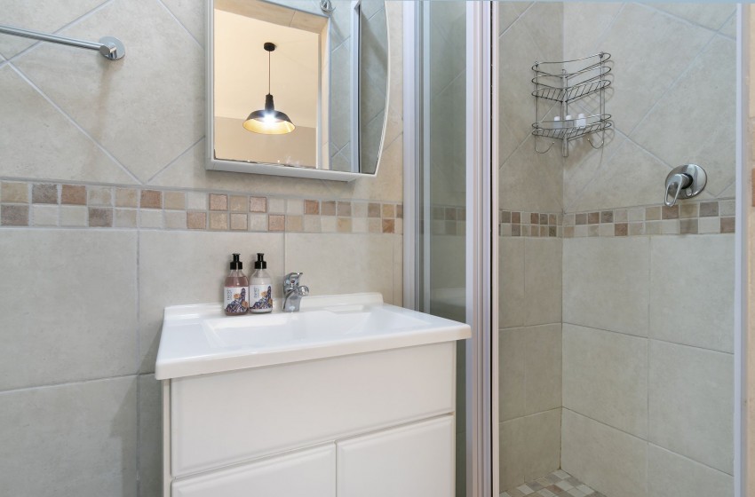 The all-white bedrooms in this apartment can comfortably accommodate up to 6 guests. The rooms all retain a neutral colour palette, with the first bedroom sporting a queen bed while the other two bedrooms sporting 2 single beds. There is an en-suite in the main bedroom and two shared bathrooms – one housing a toilet and shower while another can be used as the guest loo. The bedrooms vary between mountainous and oceanic views.