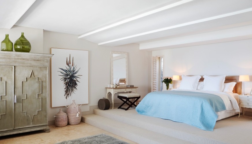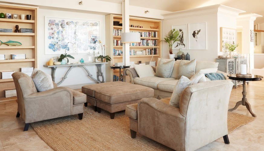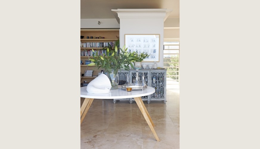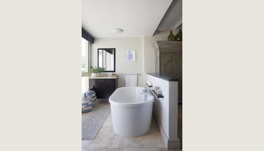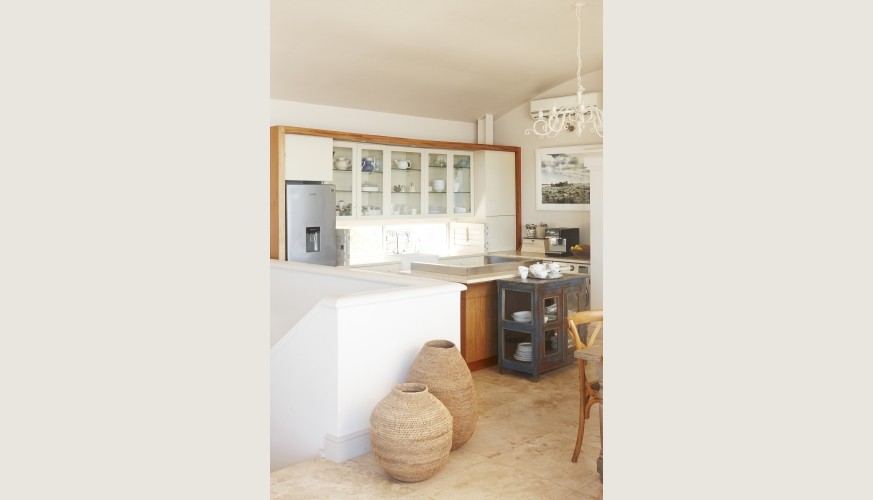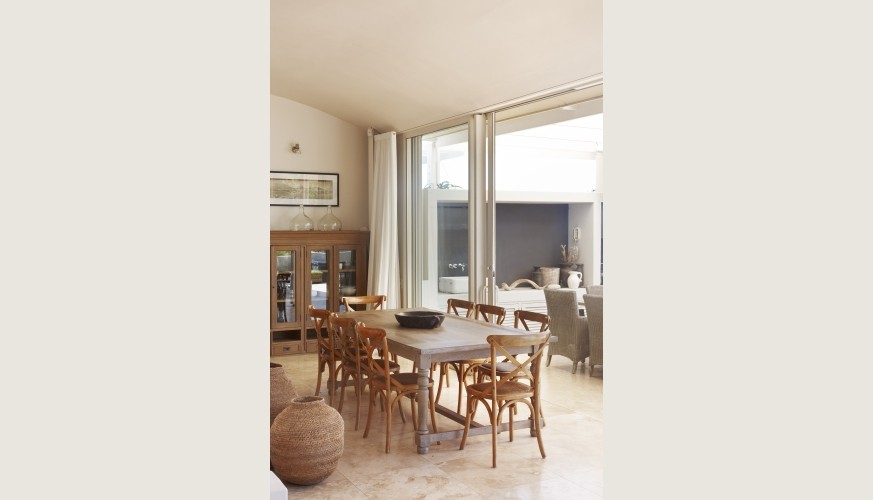 There is an immediate homely feel that is carried through the three-bedroom house along with the ocean breeze. The house boasts the most sumptuous sea view, with a deck that is made for lounging beside the jacuzzi and languid evenings watching the sun lazily sink into the Atlantic Ocean against a spectacular coral sky. There is yet another pool tucked away at the back of the house where one can escape the heat of midday. The living area is truly the heart of this home with it’s beckoning couches, built-in fireplace, generous dining room table and accompanying open plan kitchen. The space offers a warm invitation for relaxed family meals, late afternoon naps or the simple pleasure of a good read curled up on the couch. The décor echoes the welcoming atmosphere of this family space with its warm beach hues, marble flooring and intimately unique art collection.