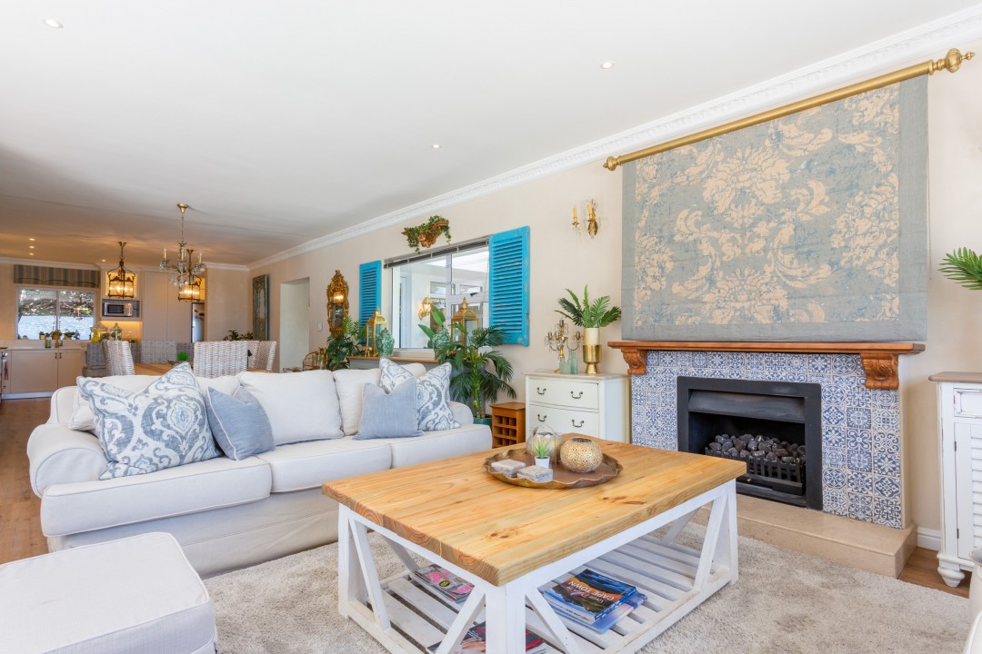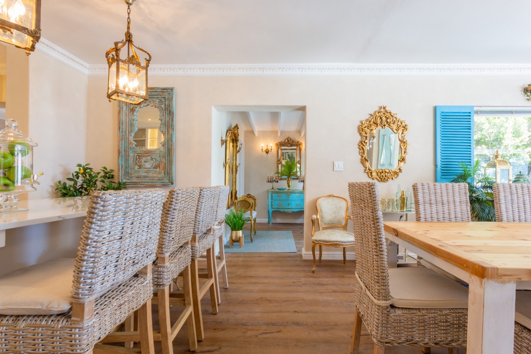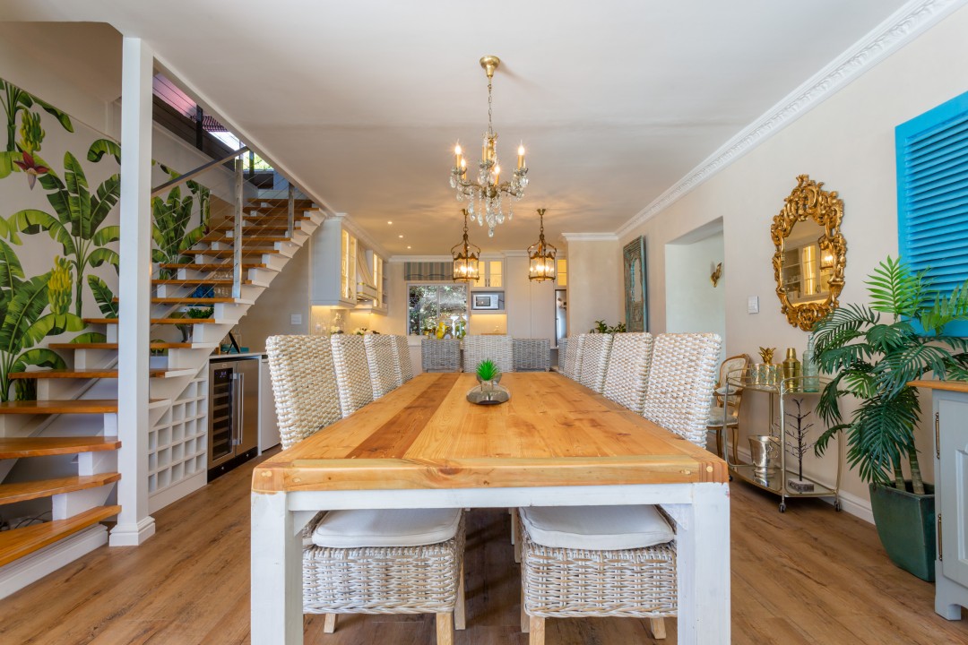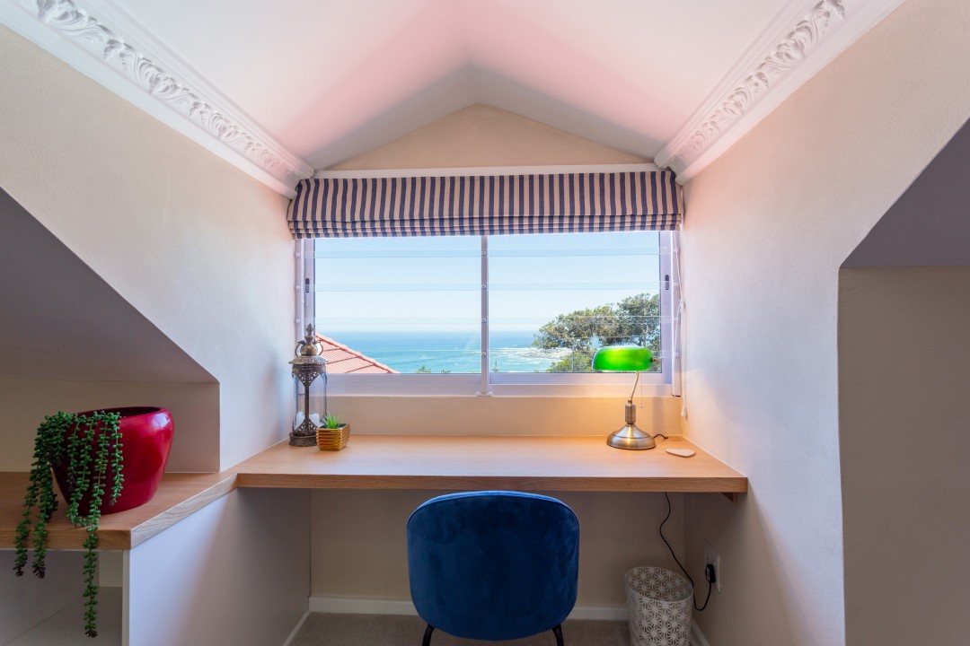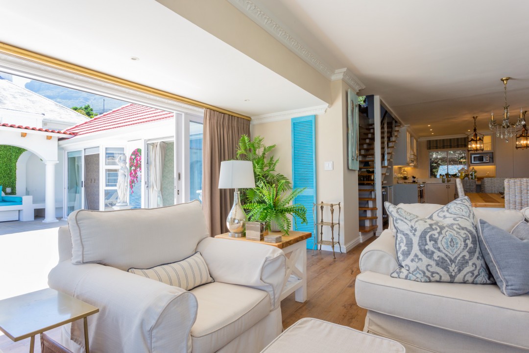 This beautiful villa is situated in a quiet cul-de-sac and is just a short drive or 15-minute walk from the palm-lined beach and laid-back cafés in Camps Bay. The entrance level of the house features spacious living and dining spaces with gleaming wooden floors and exquisite décor in natural hues with touches of Mediterranean blues. A guest bathroom is located off the dining area is available for guests in the loft bedroom to use. Large sliding doors open onto the pool deck and stunning ocean views can be seen from every angle in the room.