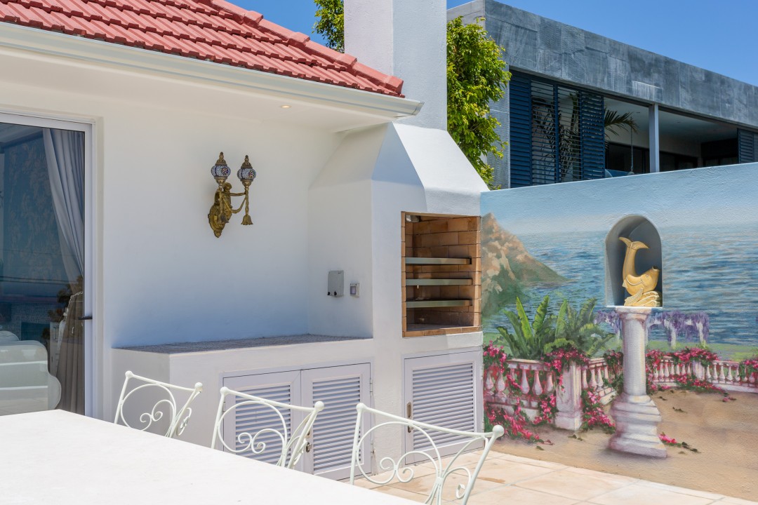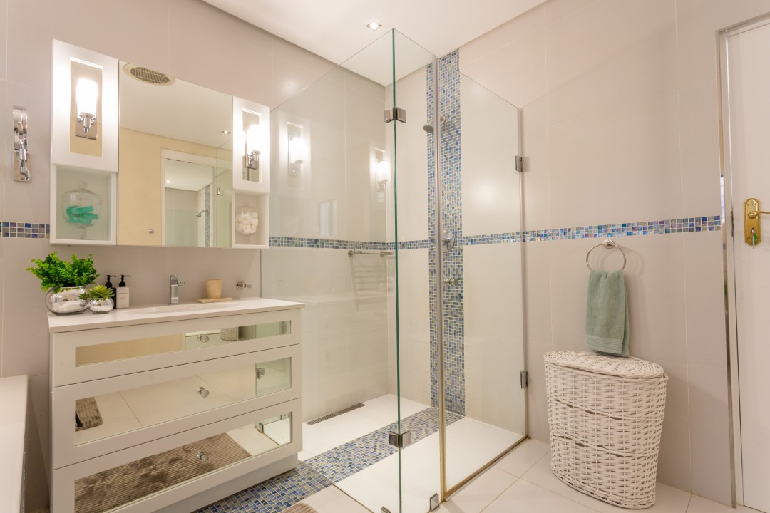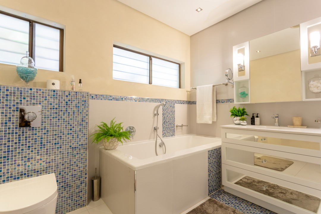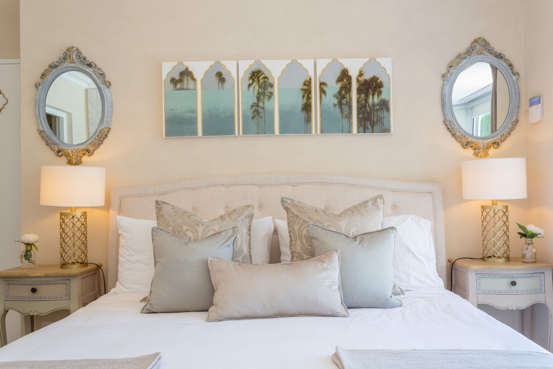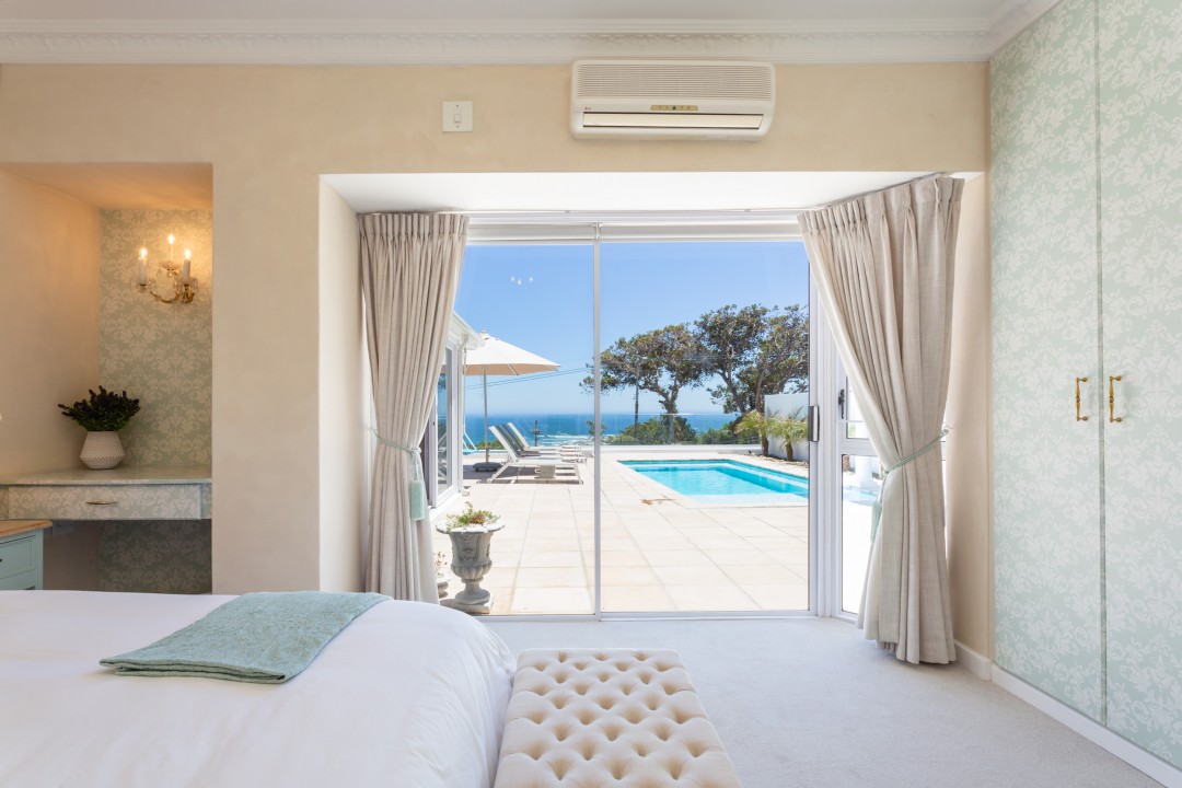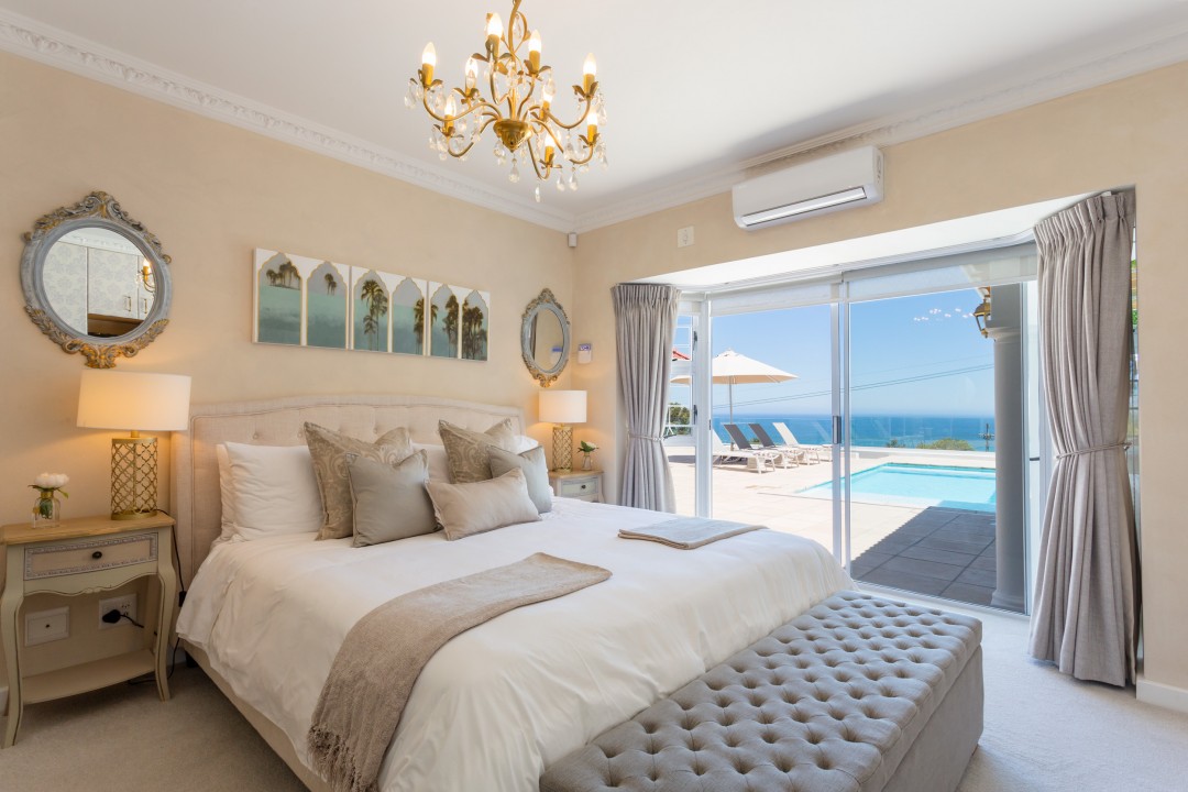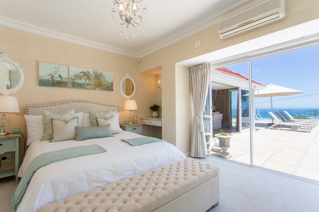 The villa has four bedrooms, three of which can be found on the ground level with a loft-style bedroom on the upper level. The master bedroom is elegantly decorated in tones of cream and white and has built-in cupboards with ample storage space and an en-suite bathroom with a lovely corner bath and a glass-enclosed shower. This bedroom has direct access to the main sun deck and swimming pool and offers stunning views of the Atlantic Ocean.