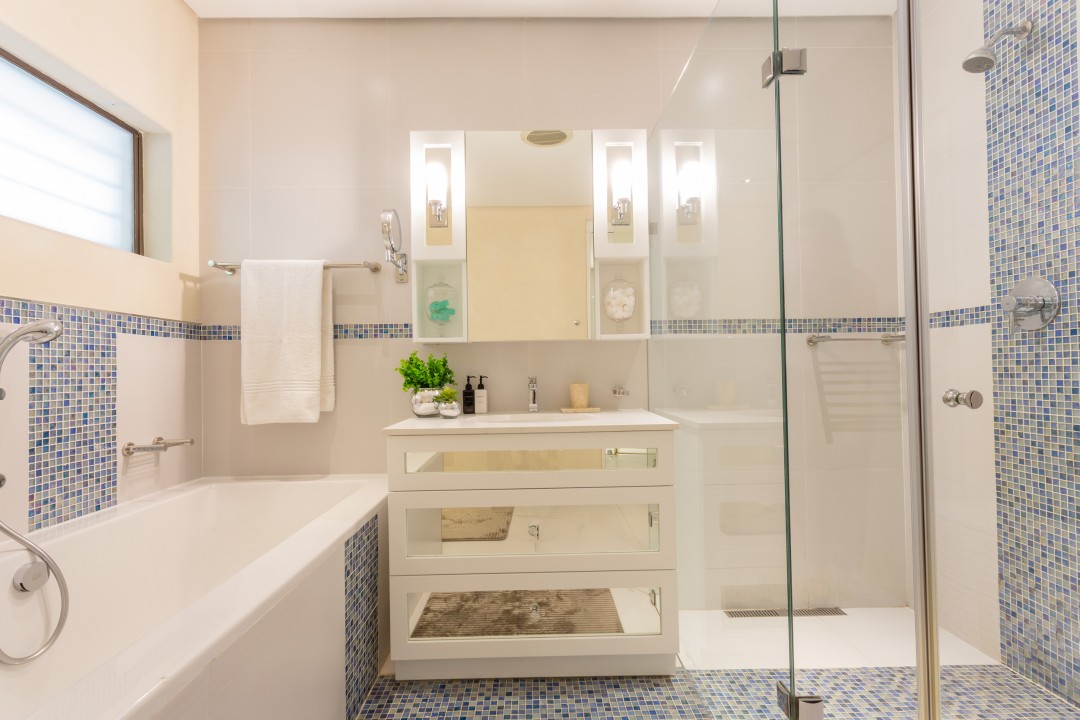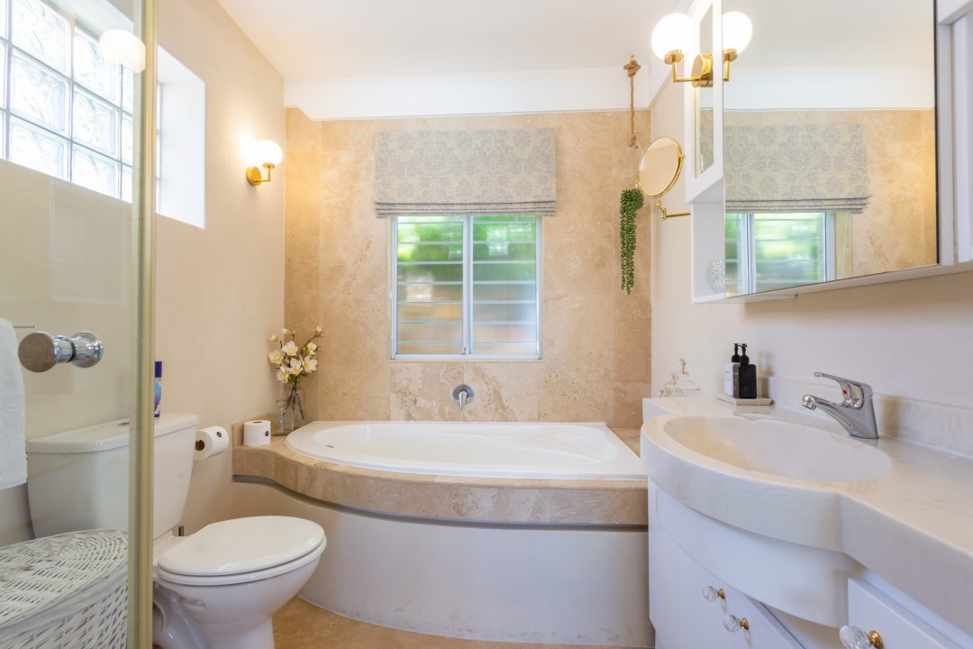 The second bedroom has a queen-size bed and shares a bathroom with the third bedroom which has a bath and a glass-enclosed shower. Both bedrooms are also decorated in subtle creamy tones and have plush designer bedding. The second bedroom opens on the terrace and pool deck with lovely sea views.