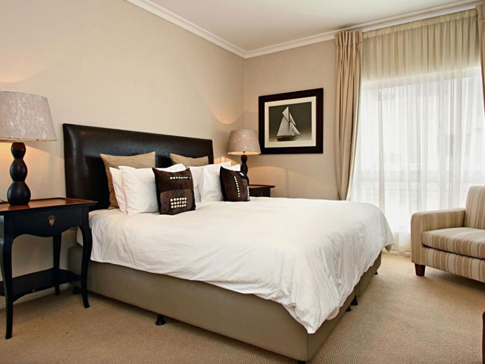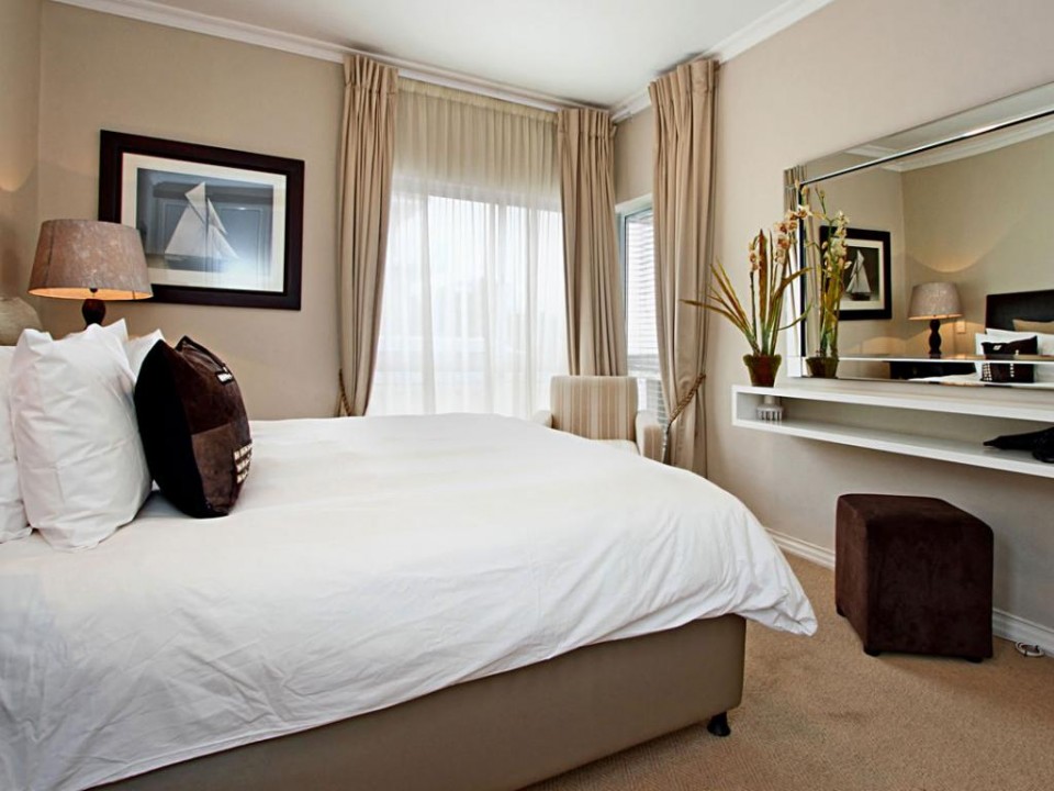 A sleek, marble-topped breakfast bar allows for easy meals and a stylish round glass dining table in the centre of the room seats four for entertaining. The master bedroom offers a king-sized bed, a spacious en-suite bathroom with a bathtub, and single vanity, while the second bedroom faces the Twelve Apostle’s mountains, and offers twin beds, ample cupboard space and has a dedicated bathroom with a shower.