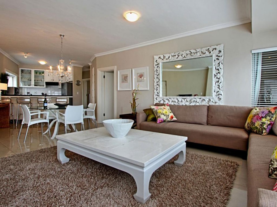 Offering wonderful views of the Atlantic Ocean and the Twelve Apostle’s mountain range, the apartment boasts contemporary-chic décor, modern amenities, and secure parking. Spacious and bright open-plan living spaces greet you on entering the apartment, where a well-laid out lounge has plush custom-made couches in warm, natural hues and a stylish corner couch that is ideal for relaxing with a book.