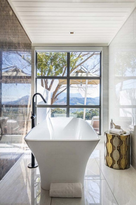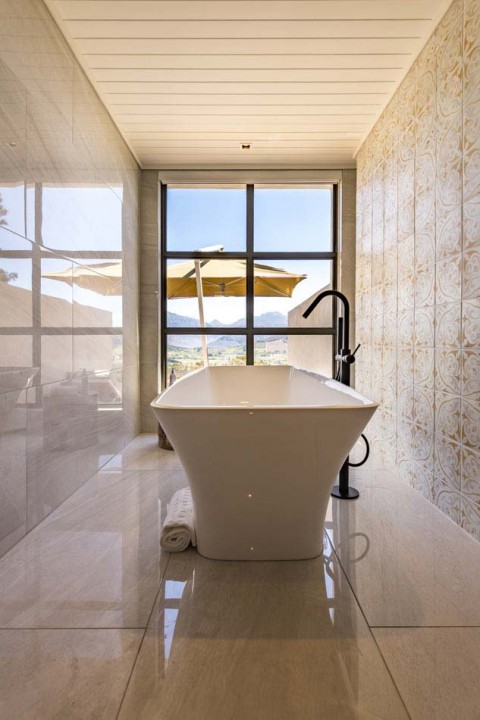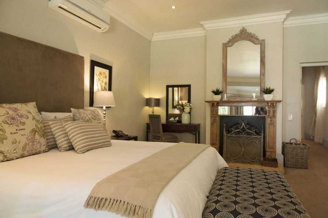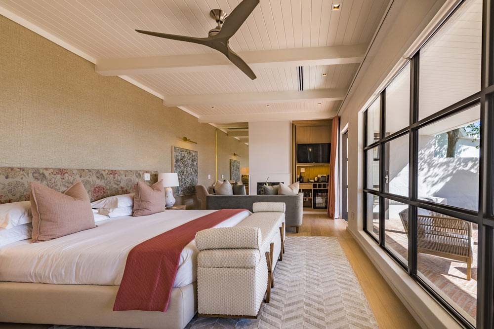 En-suite bathroom (bath and walk-in shower) with heated towel rails and under floor heating. Air conditioning and underfloor heating in the bedroom. Tea and coffee making facilities and a complimentary stocked mini bar. Electronic safe. Smart Hospitality Television, enabling you to stream movies from your mobile device. Wood burning fireplace. Complimentary Wireless internet connection. Private patio overlooking the vineyard. 42m2 , Suite inclusive of the bathroom excluding verandah 21m2 , Verandah under roof.