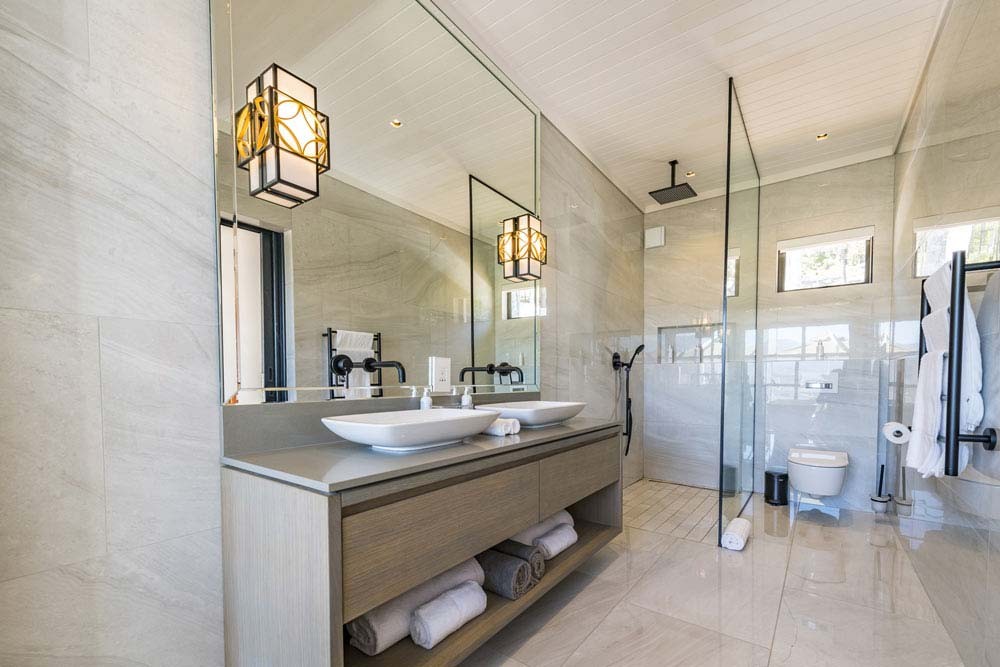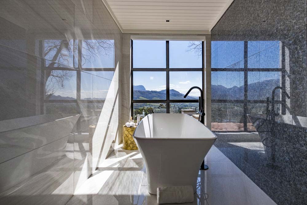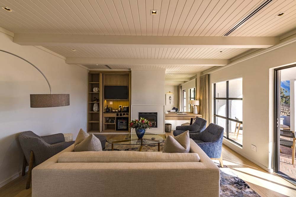 King size bed – extra length. En-suite bathroom (bath and walk-in shower) with heated towel rails and under floor heating. Air conditioning and underfloor heating in the bedroom. Tea and coffee making facilities and a complimentary stocked mini bar. Electronic safe. Smart Hospitality Television, enabling you to stream movies from your mobile device. Separated living area with a guest bathroom (including a sleeper couch that can accommodate a child or adolescent) Wood burning fireplace in the bedroom Wireless internet connection. Shared family sized pool ( shared between four suites) Verandah overlooking the vineyards. 67m2 , inclusive of the bathroom