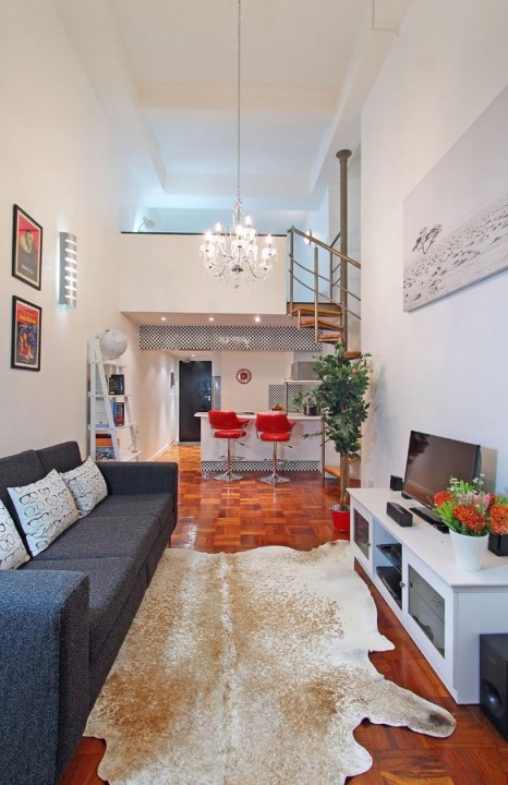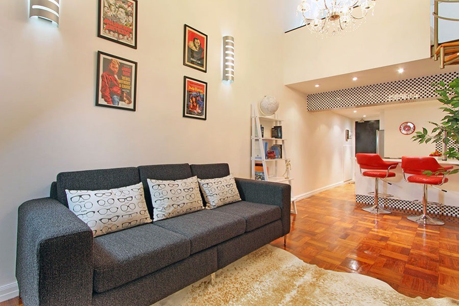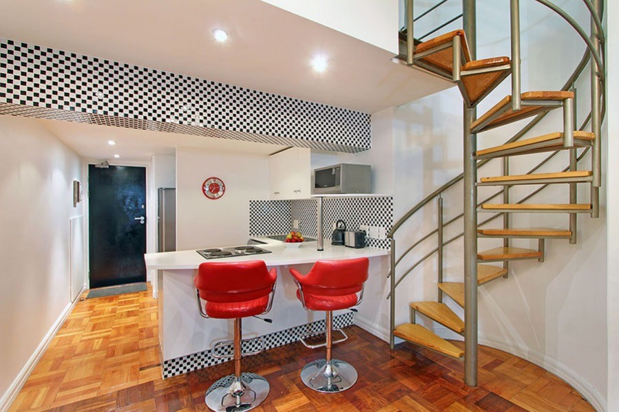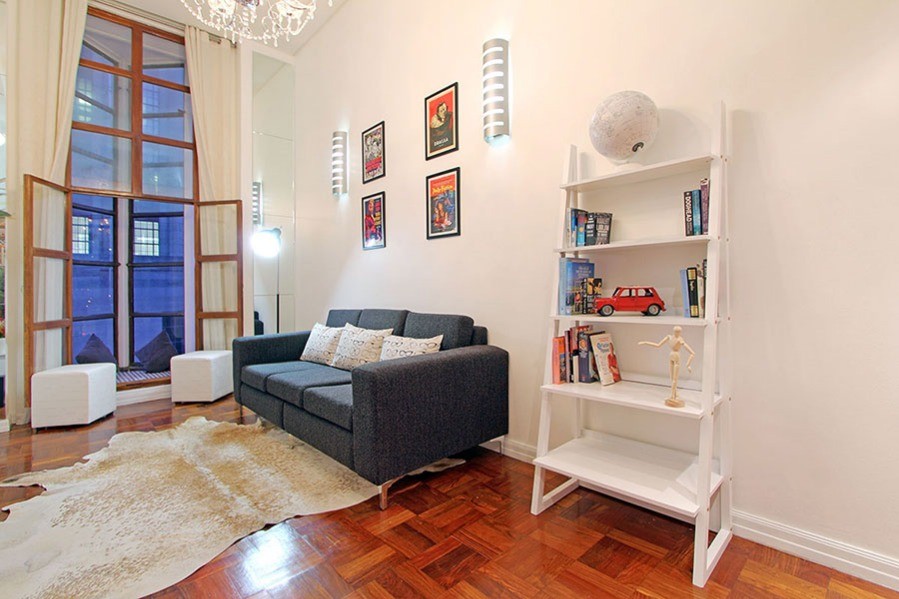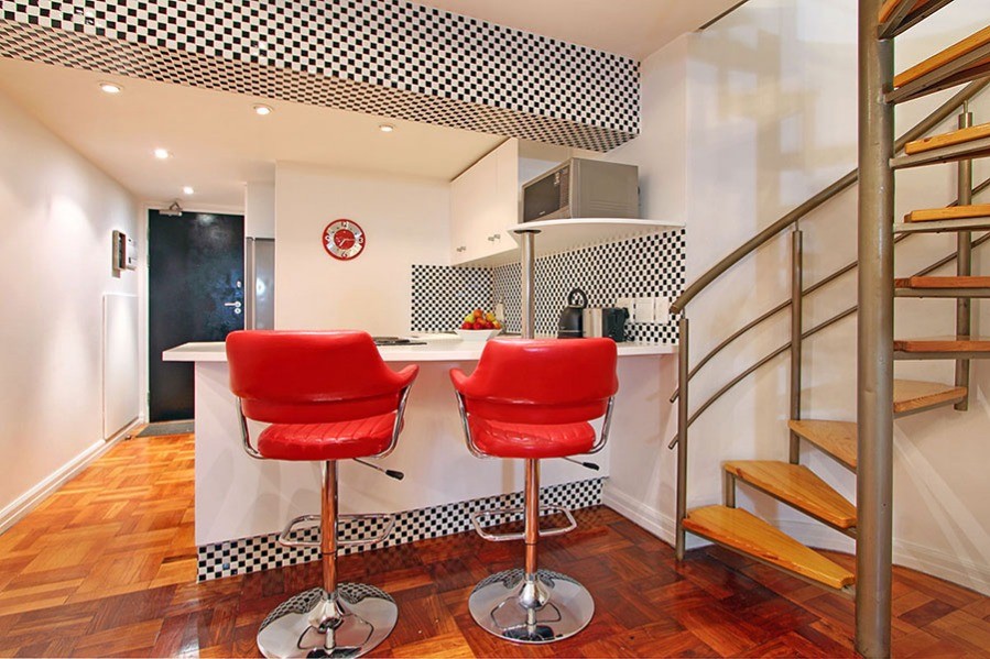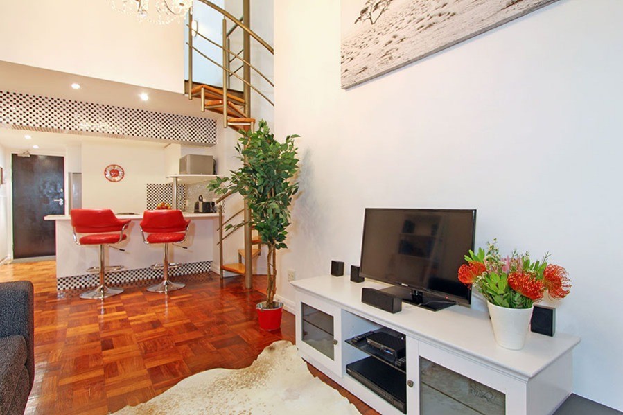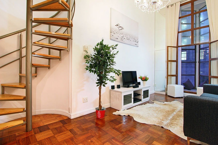 This art deco feature of Mutual Heights, along with double-volume ceilings, tall windows, parquet floors and a spiral staircase combine to give you a Cape Town holiday base with a lot of style.