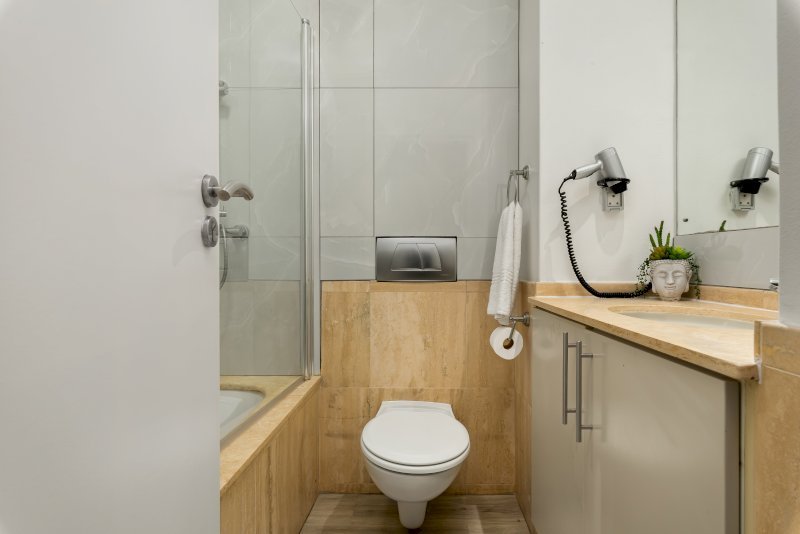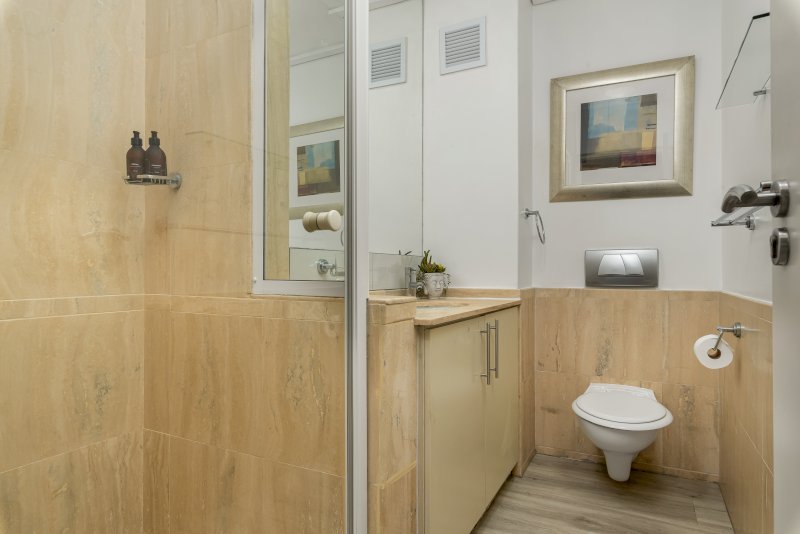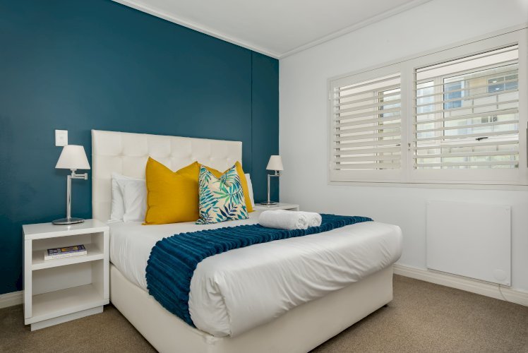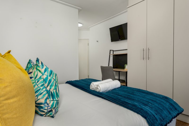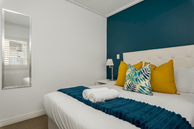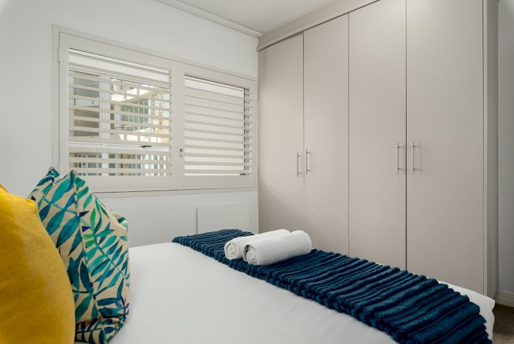 The cosy second bedroom is furnished with a comfortable double bed, generous cabinet space for longer stays, and has access to a separate bathroom featuring a spacious walk-in shower.