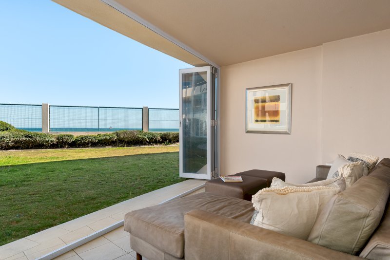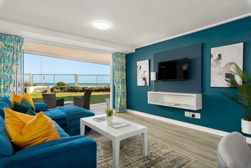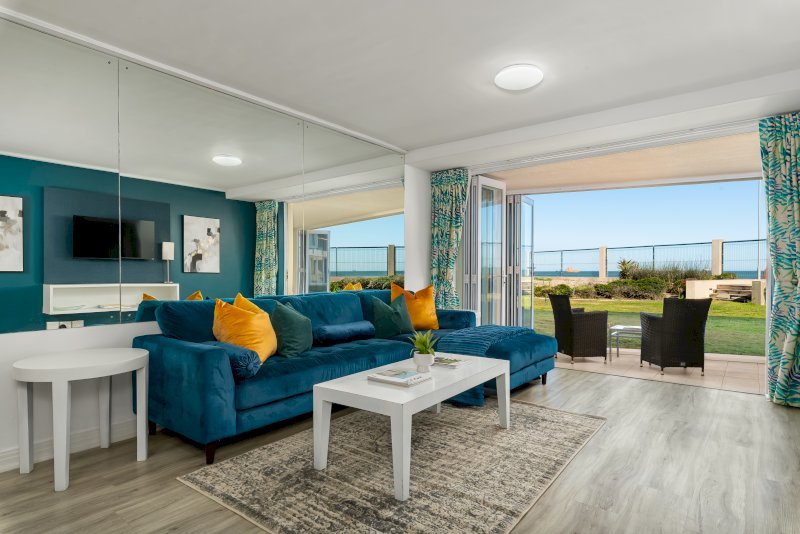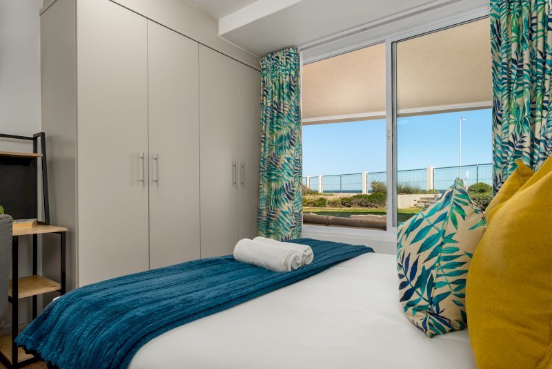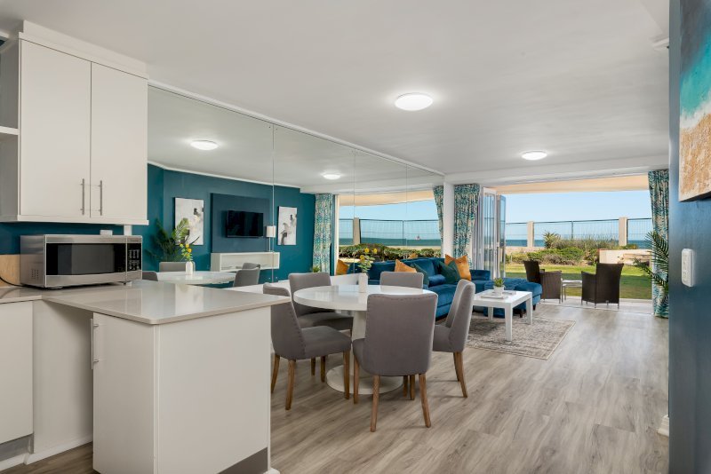 This well-curved apartment with an open plan living room layout offers a fully equipped kitchen, perfect for whipping up a hearty meal in the kitchen to enjoy at the dining table with seating for four. The kitchen and dining area flow into the lounge area which boasts a cosy L-shaped velvet couch perfect for relaxing while enjoying a movie night or binge-watching your favourite shows on the Smart TV. The Lounge leads into a patio with cosy furniture to lounge on and enjoy ocean sunset views, and floor-to-ceiling shutters that open up into a large yard.