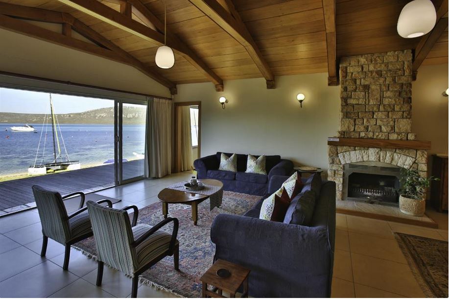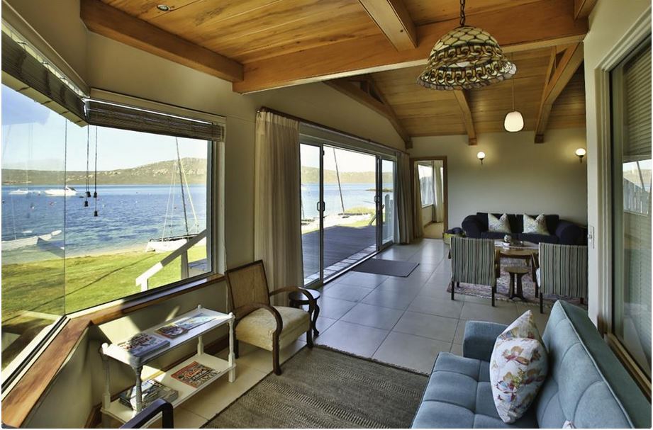 Sandbaai Villa captures the essence of lagoon-side living with its light-filled interiors and coastal charm. Spacious open-plan living, dining, and kitchen areas are designed for comfort and connection, often featuring cozy touches such as fireplaces. Expansive windows and sliding doors create a seamless link to the sheltered outdoor spaces, inviting guests to relax, dine, or unwind while taking in uninterrupted views of the lagoon.