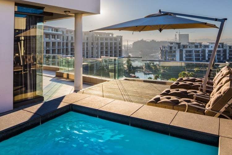 The Penthouse offers guests 2 balconies – one on each level. From here they can admire the gorgeous panoramic view of the marina, canal and yacht basin and even take a dip in the private pool. All the luxury apartments are serviced which means that you won’t have to worry about any cleaning up. Come and relax with us while you discover and explore Cape Town.