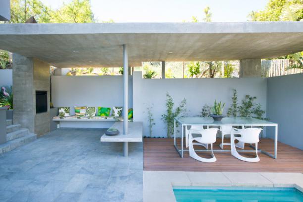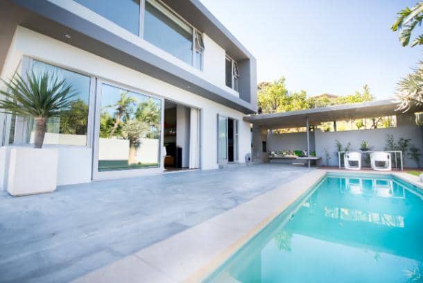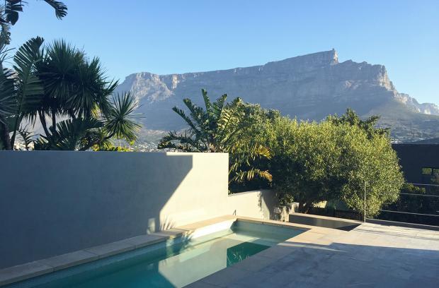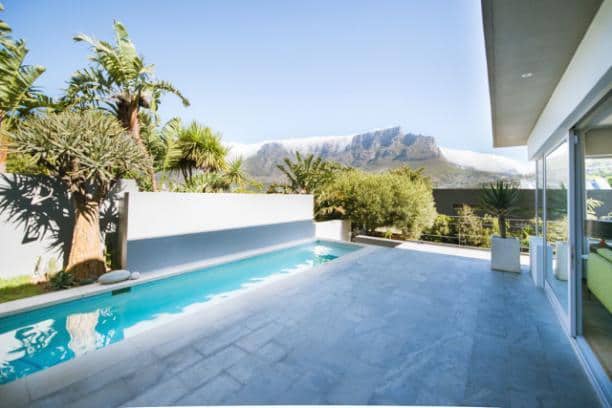 One enters via a steep driveway that takes you up to the main entrance. A short flight of steps then takes you to the first level where you are greeted with the pool and outdoor area. Immediately your breath is taken away by the most magnificent views of Table Mountain and Lions Head directly in front of you. From the pool deck you enter via the kitchen and you have your entertainment area with a lovely open plan lounge and dining area, and in the centre a wood fireplace. The three bedrooms are located on the top level up an additional flight of stairs. The Master bedroom is en-suite with surrounding views of Lions Head, Table Mountain and the city and the additional two bedrooms are of equal size share a bathroom