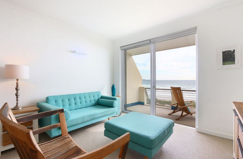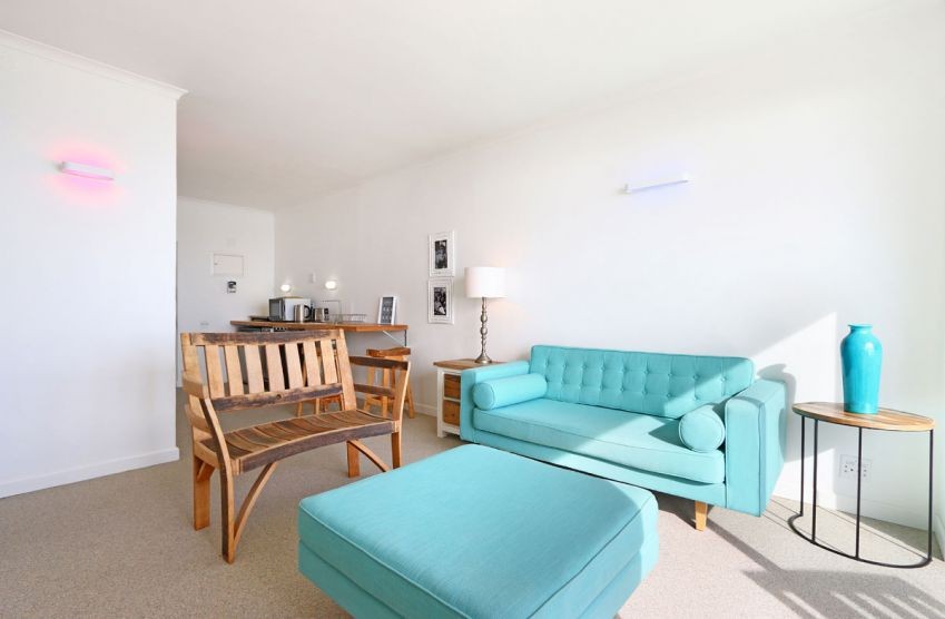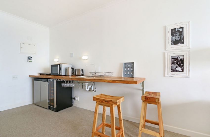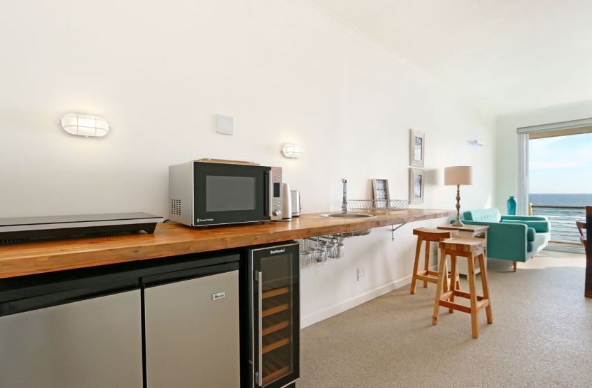The main interior is open plan, with a kitchenette flowing into the lounge area. The sleek kitchenette has a microwave, fridge, kettle and toaster among other additional features. The long wall-mounted counter with two stools, comprising of a wooden sink. The lounge, with a beautiful shade of blue, consists of a large couch, wooden bench and a large ottoman, arranged around a wall-mounted flat-screen TV. The lounge has sliding doors that lead out to an extensive terrace with chairs, a comfortable vantage point for the breathtaking sea and mountain views.