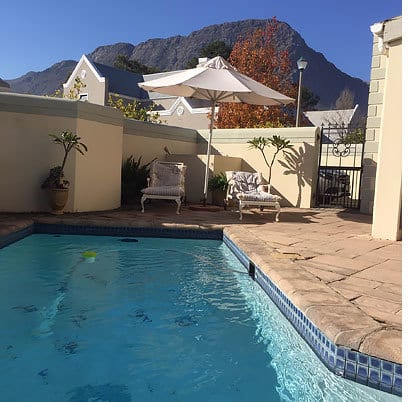 Property offers central village location, 5 / 10 minutes walk to the finest restaurants or a short drive to the valley’s many vineyards. Nice private pool area, garden and perfect braai facility and stunning mountain views. Garage parking for one car plus off street parking for a second car.