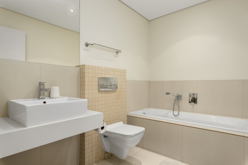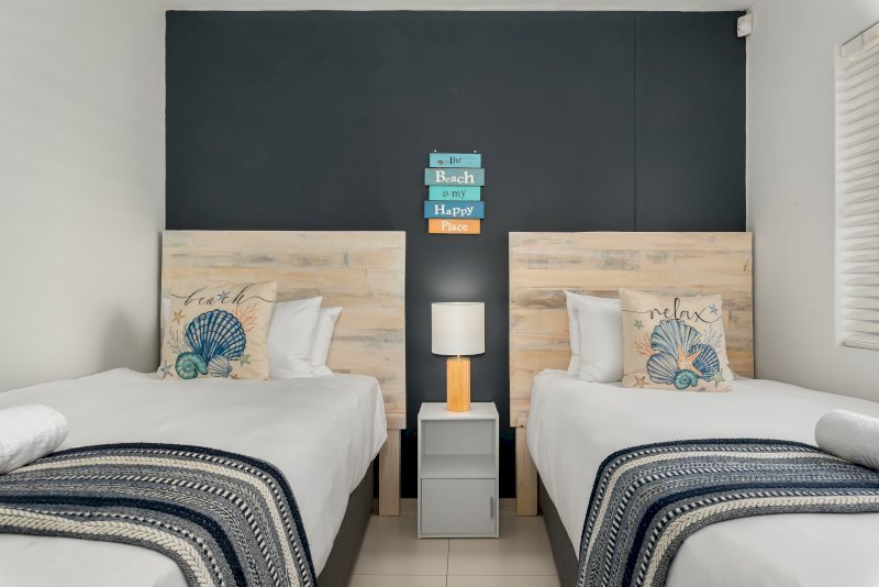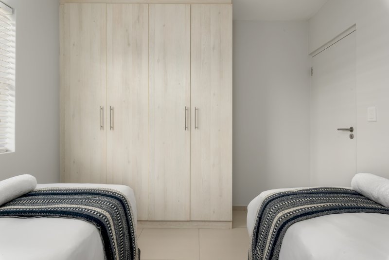 The second bedroom has two single beds, ample cabinet space and access to a separate bathroom with a bathtub.