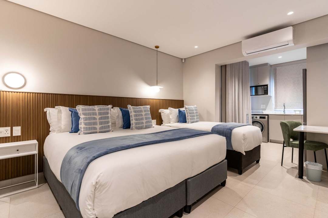 As you enter the apartment, you’ll be greeted by an open-plan lounge area featuring large glass sliding doors that frame the mesmerizing ocean views. The lounge is equipped with a big screen TV, air-conditioning making it an ideal spot for relaxation and entertainment. The seamless flow from the lounge to the open-plan dining area and modern kitchen creates a welcoming and spacious atmosphere. The kitchen is fully fitted with top-of-the-line appliances and includes a convenient scullery down the passage, ensuring you have everything you need for a comfortable stay.