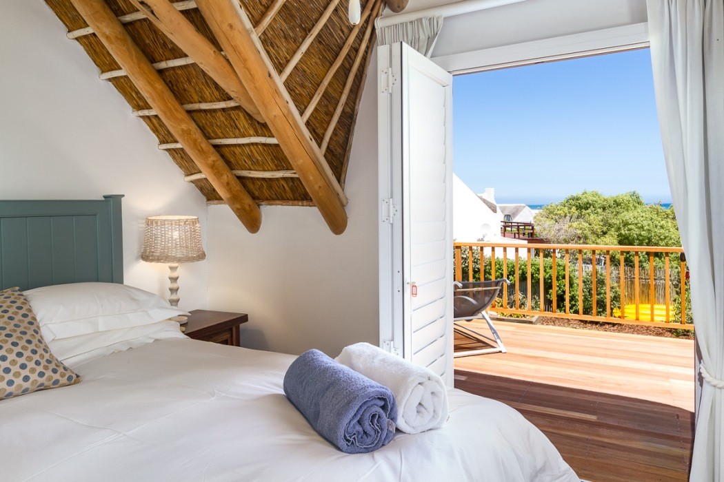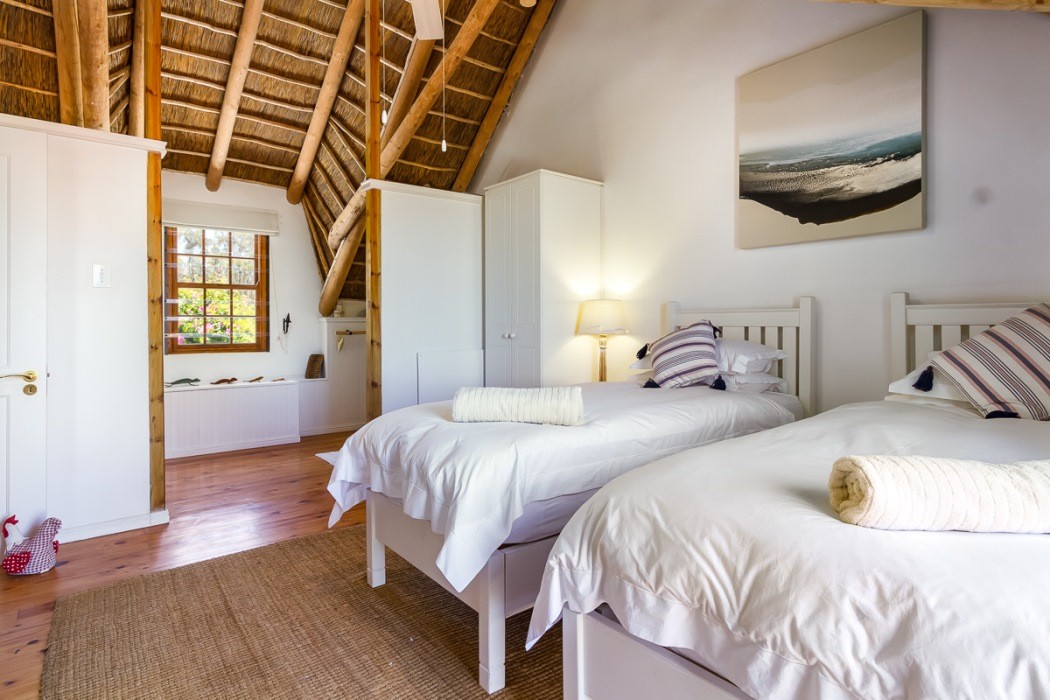The lounge and kitchen form a light, open-plan area, with comfortable seating, beautiful beamed ceilings, and a reed roof in the kitchen. The lounge area features a log fire place and antique-style couches, combining old and new to create a wonderfully relaxed ‘beachy’ feel. The dining area is an enclosed patio which leads to the pool. The modest kitchen is fully equipped. A small separate TV lounge upstairs between two bedrooms.