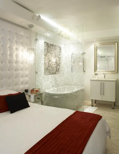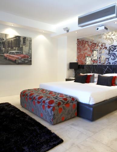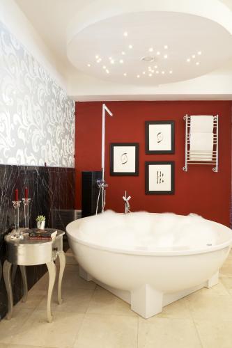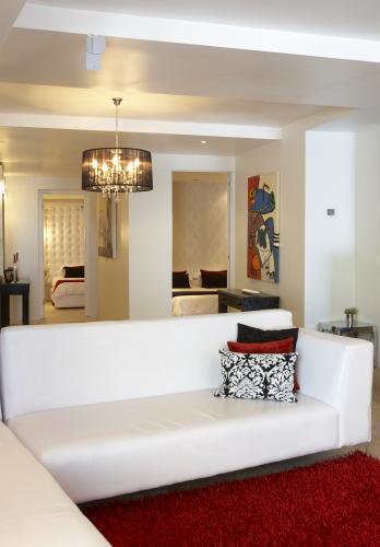 The master bedroom, tastefully decorated in red, black and white, has a mega-soft shaggy carpet, a comfy couch from which to admire the sea view, and smart bedside lamps for night time reading. Sliding doors lead out onto the balcony with direct access to the pool, and the en suite bathroom has a sizeable round bath perfect for winding down after a day in the sun. The second bedroom boasts elegant silver leaf nightstands and tables, and a modish decorated glass barrier divides the bedroom and the en suite bathroom, which contains a nicely-sized bath, glass enclosed shower, and toilet.