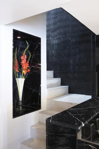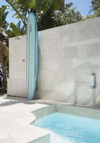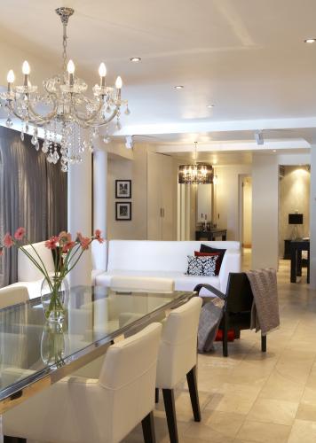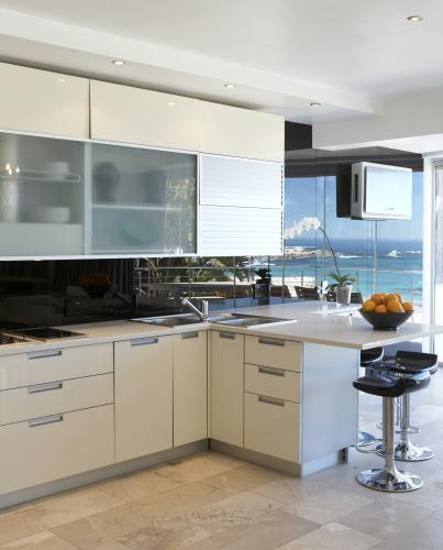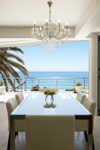 The dining room houses a glass dining table with a lovely thick silver frame, surrounded by elegant white chairs. Sliding doors open out onto the tiled balcony, where sundowners can be enjoyed along with the spectacular view of the ocean almost directly below. The balcony is protected from the worst of Cape Town’s wind, and on warm days a shower outside next to the splash pool will provide a cool respite, or soak up the sun on one of the four sun loungers.
